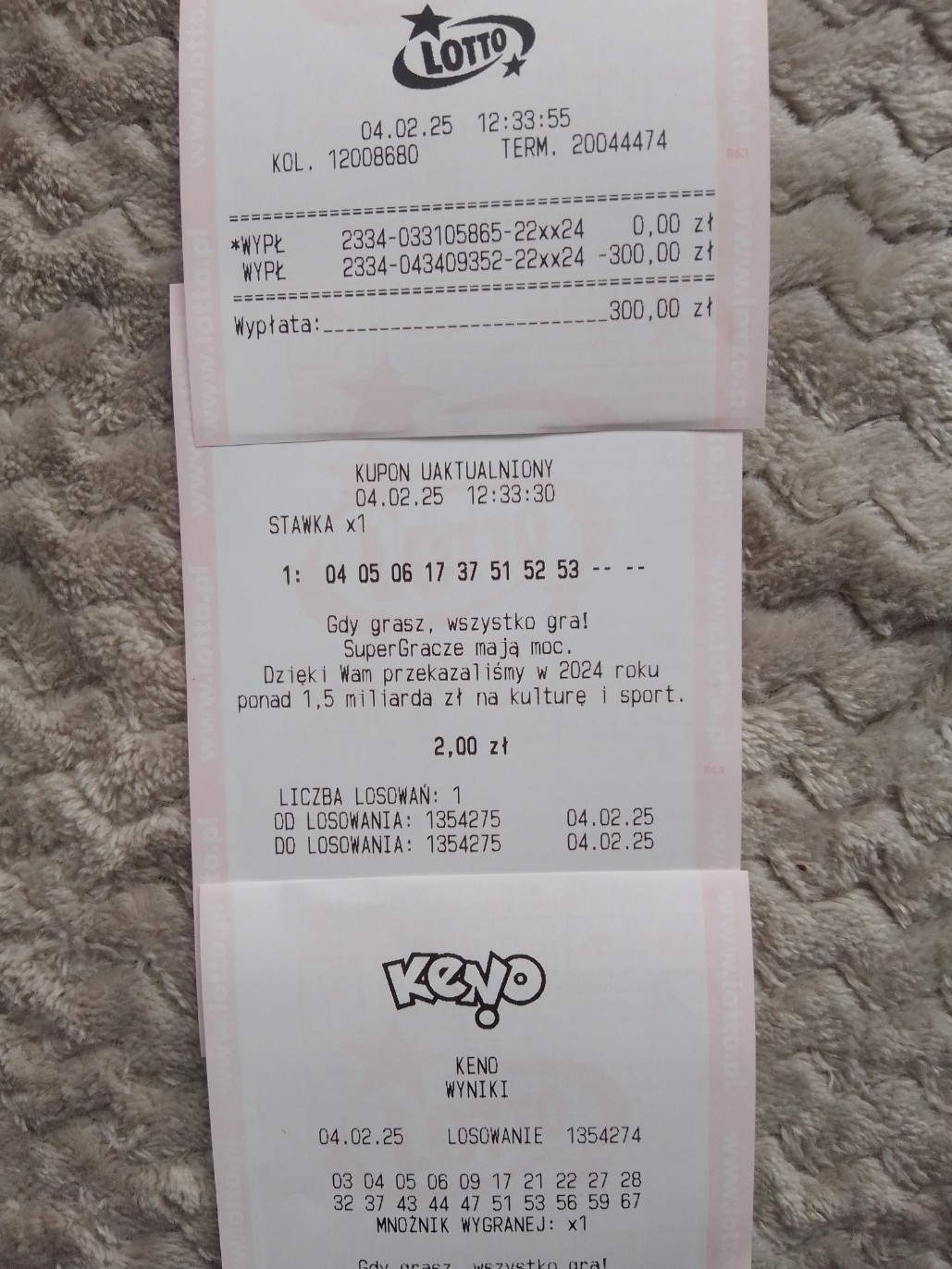 Cud, trafiłem coś w keno. Zagrałem 2 zakłady, 3 losowania z mnożnikiem za 24zł. W ostatnim losowaniu 3/5 i mnożnik x3, całe 12zł