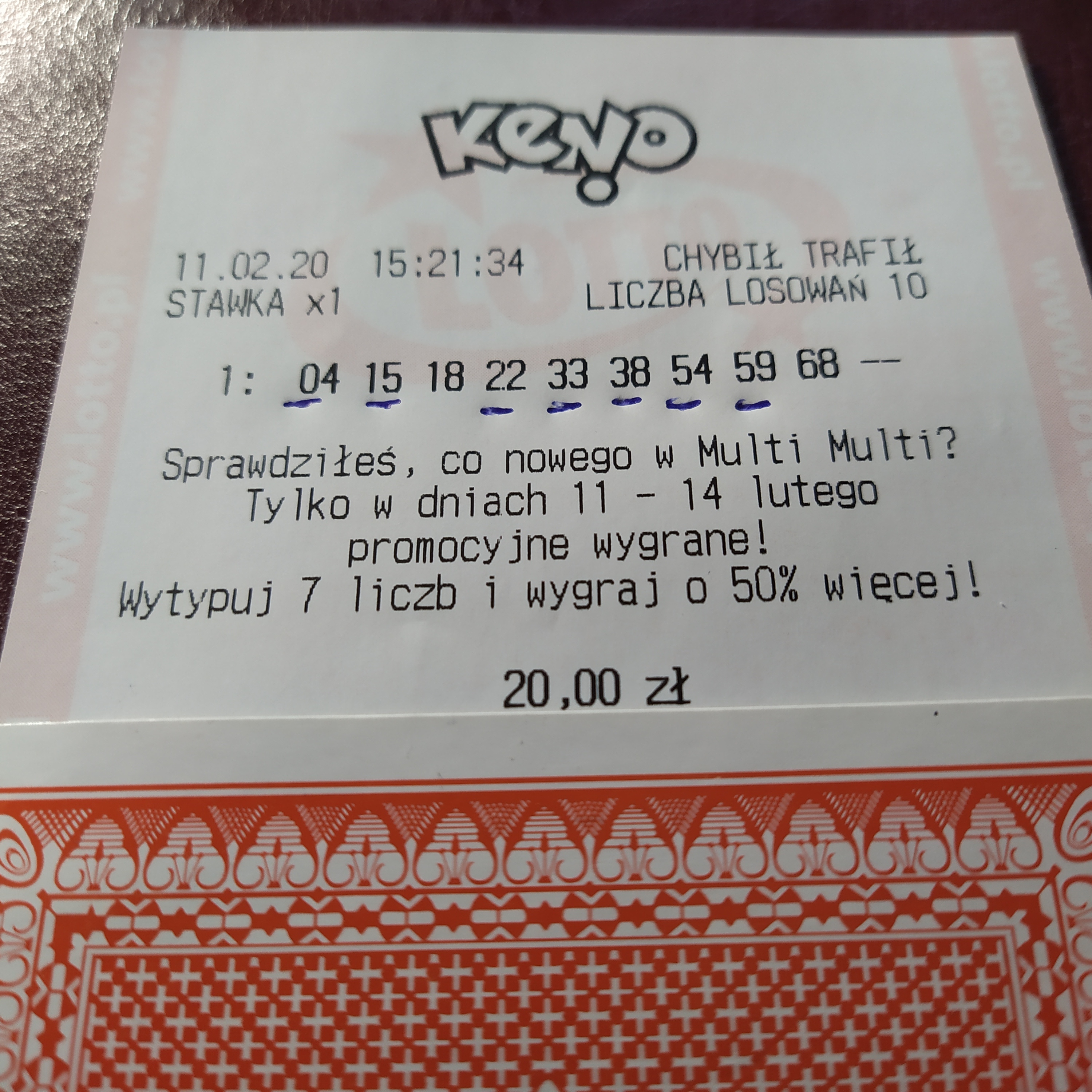 7/9 w Keno wygrana 100 zł.Kupon z zeszłego tygodnia.