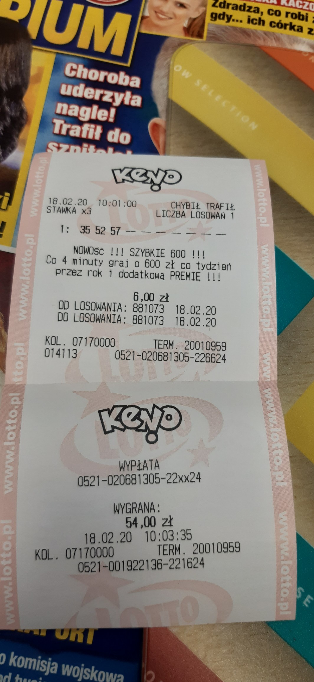 Pięknie, gratulacje. Przez SZ600 Keno z tego co widzę trochę w kolekturach przymarło.
