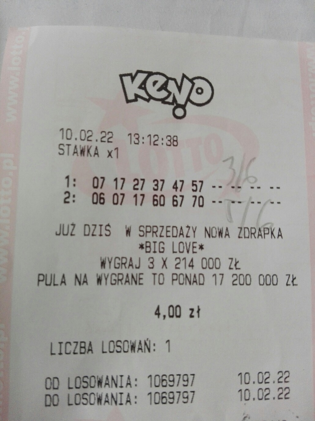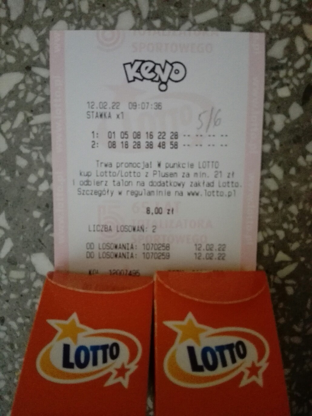 Nie często puszczam 6/6 z chybika, ale że to było w żabce gdzie nawet blankietów ni ma; zagrałem jak zwykle za 8 i wpadło pierwsze 5/6 w tym roku z chybika. Dziś rano tez gralem za 8zl -kreslone i wpadło tylko 2-ale zagrałem 9/9 chybik i weszlo 6/9.