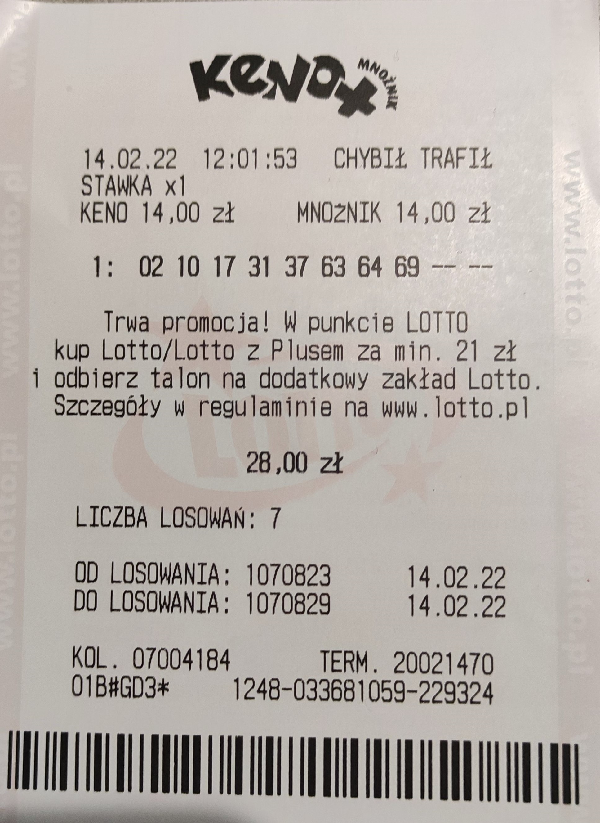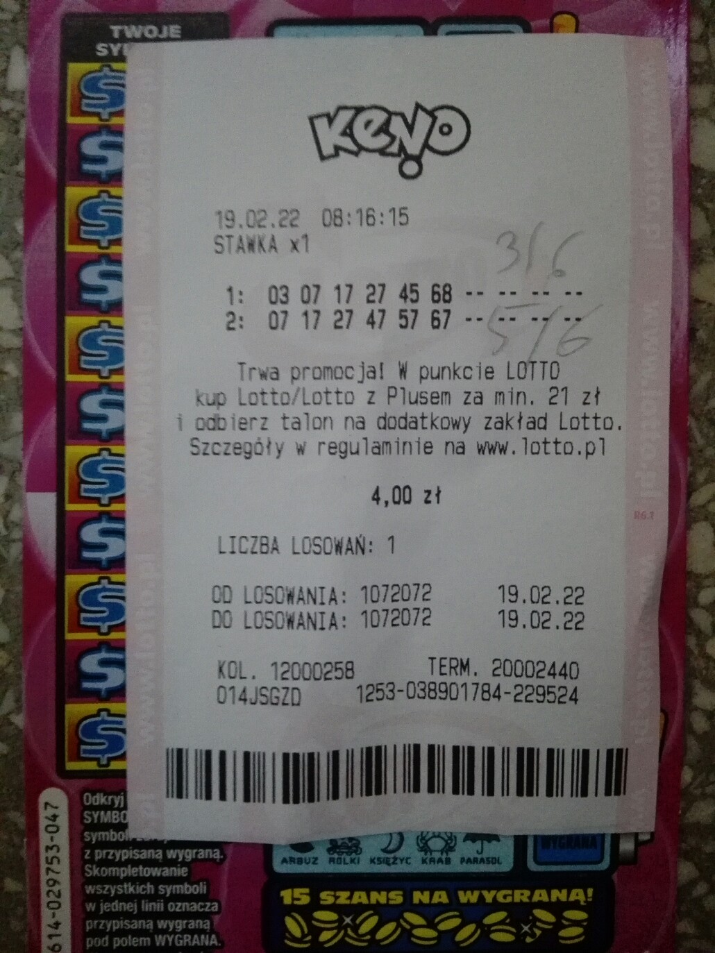 Fajna wygrana. A ja poszedłem w Keno najprostszym sposobem jakim można iść, bo niestety w 6/6 mi kompletnie nie idzie.