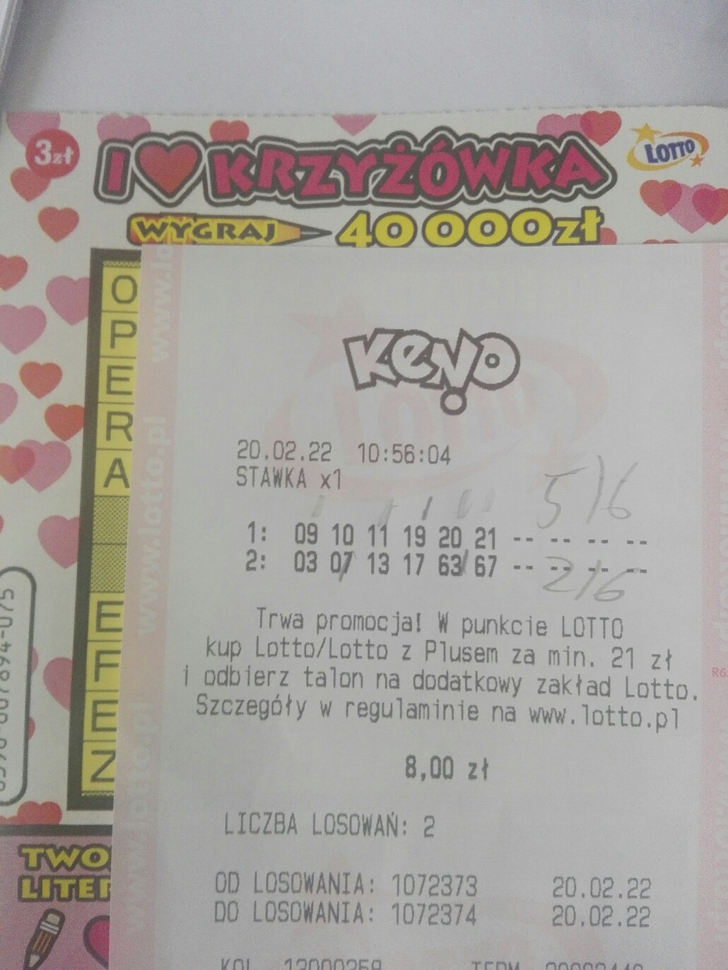 Dziś walentynkowo trafione 6 z 8 z mnożnikiem 10.