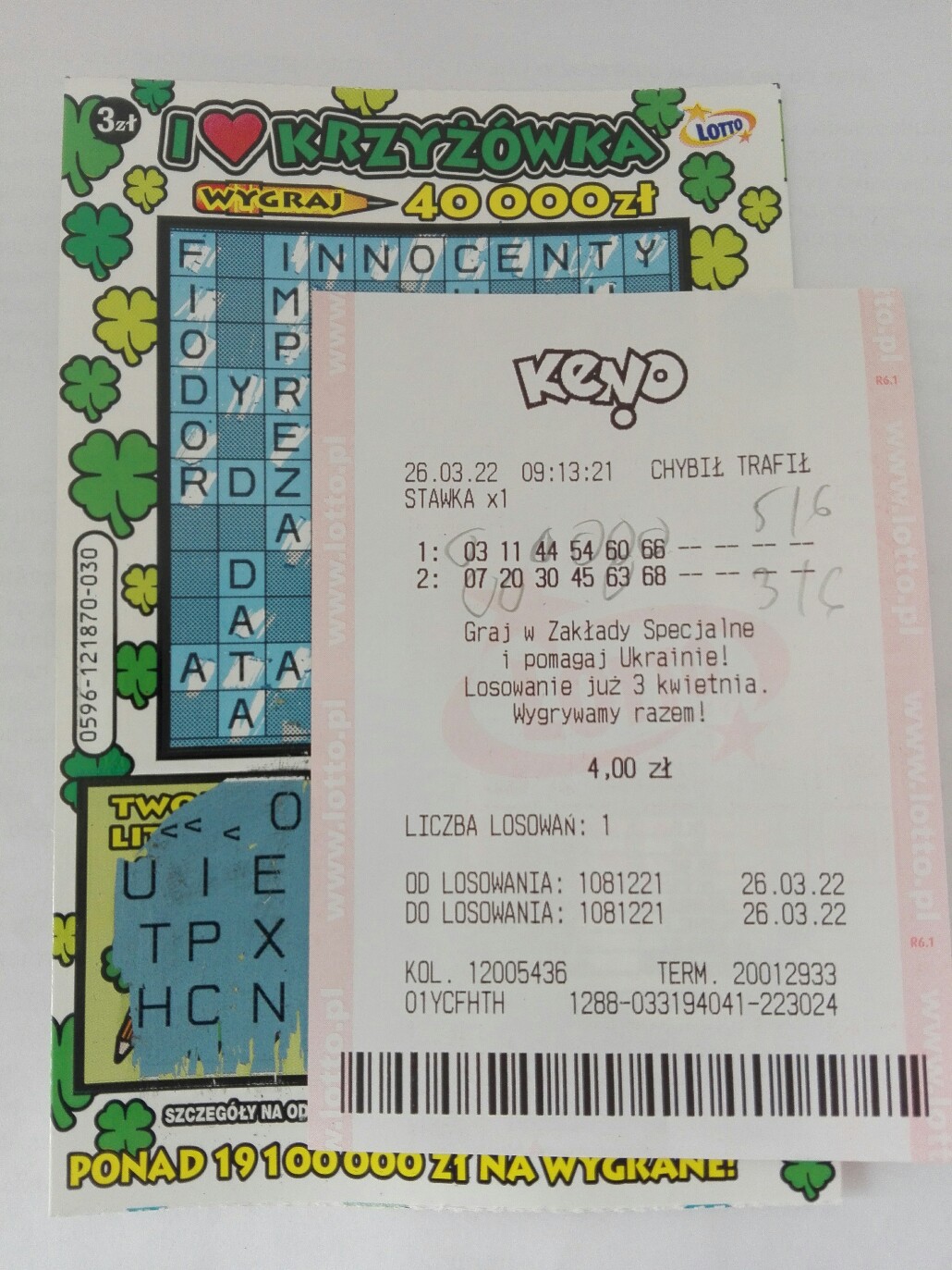 Kupilem keno za 4, dwie krzyz. i s.linie i wpadlo 5/6 i pierwszy raz 20 w krzyz konniczynkowej.Wygraną wyplacilem w innej budzie i tym razem skreslilem keno na 6 za. 8zl i mam tylko 2 zl wygrane. Na popoludnie drapanie zostawilem drugą krzyz 075 i s.linie 026.