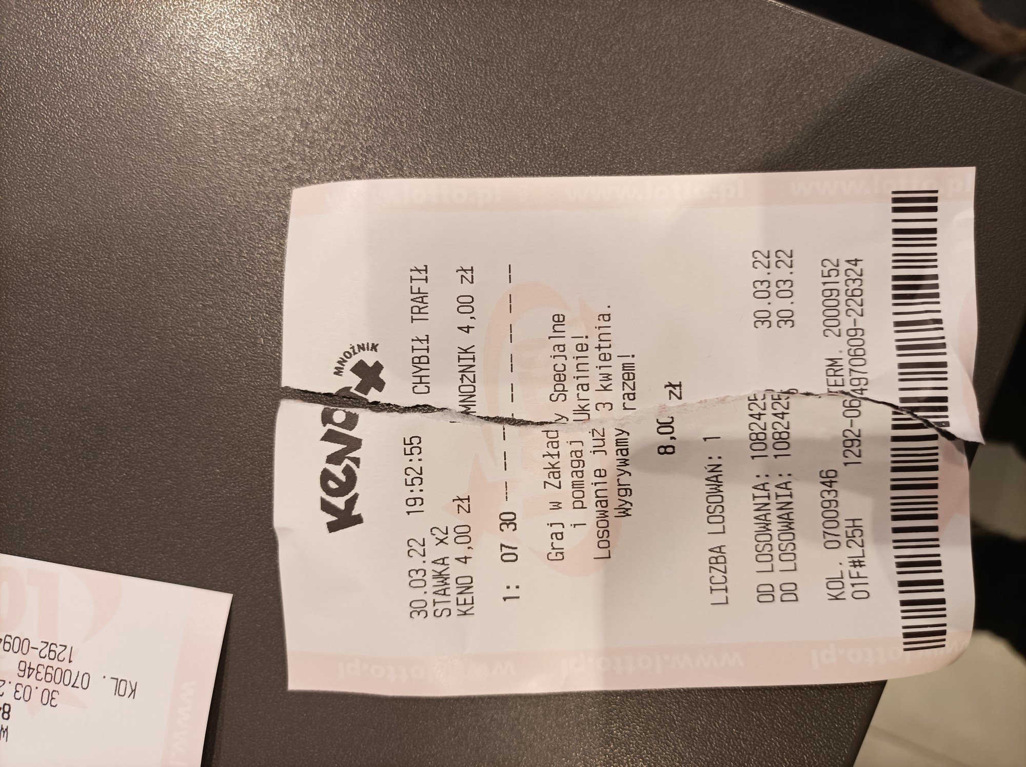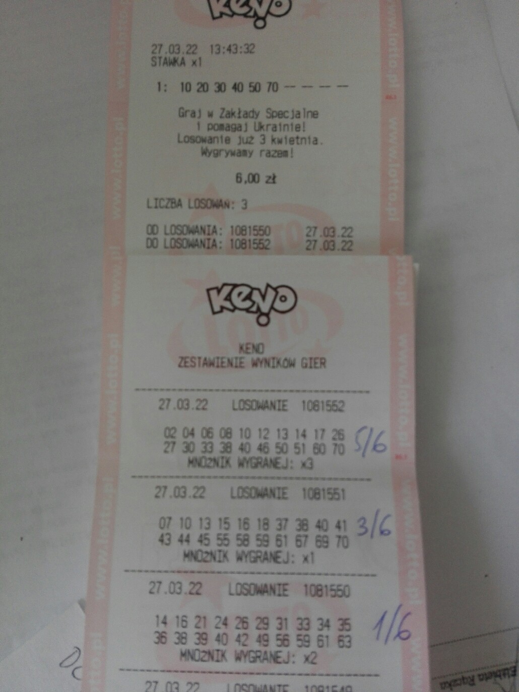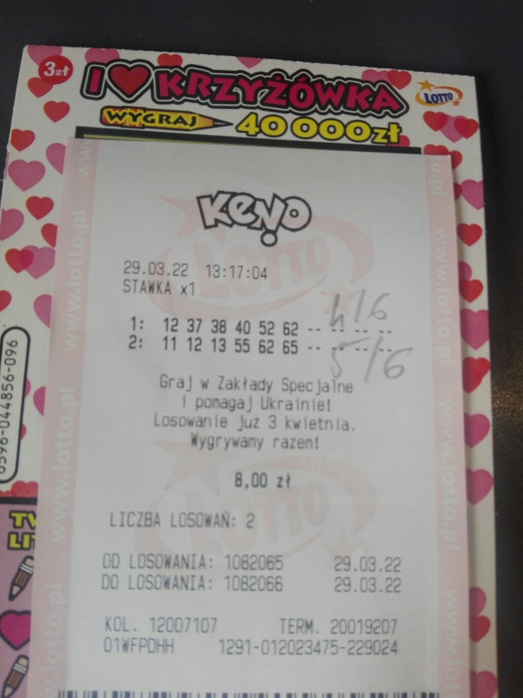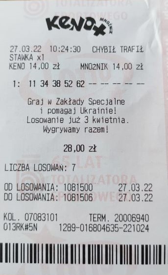 Pozazdrościłem wam trochę i puściłem po 1 zakładzie na 5 i 6 liczb na stawce i 1 zakład na 2 liczby na stawce x 2 i z mnożnikiem . Kupon przedarty , bo nie zdążyłem w czas wyrwać kolektorowi