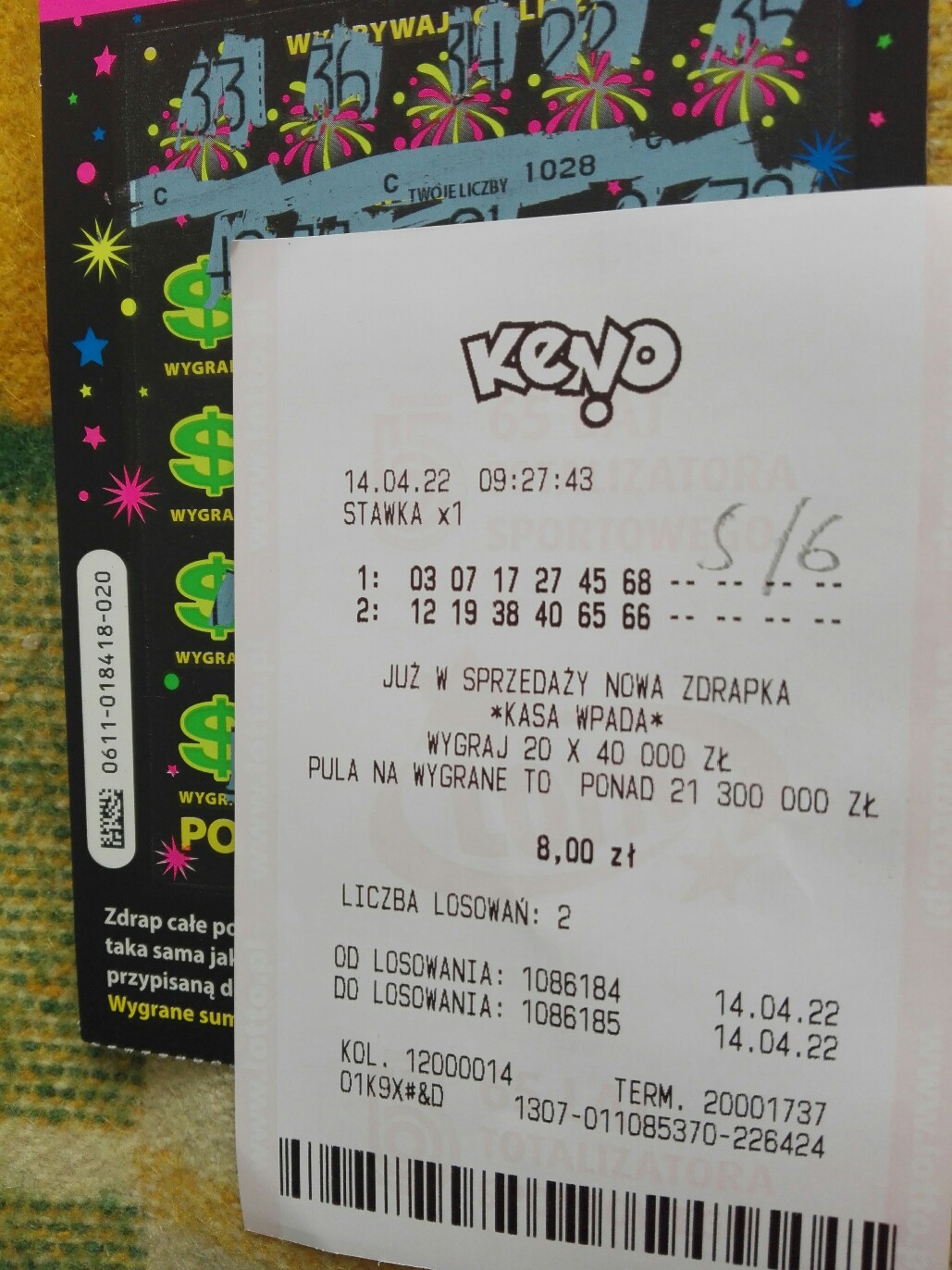 Poszedłem wyplacić zdrapki i puscilem 2x6/6 chybik-bylo 2, zagralem ponownie i wpadlo 5/6