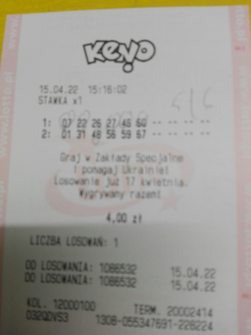 Mojej mamie pani z kolektury sprzedała zamiast Keno na 7 skreśleń, 2 zakłady, 2 losowania, to puściła 2 skreślenia ze stawką x7 na 2 losowania.