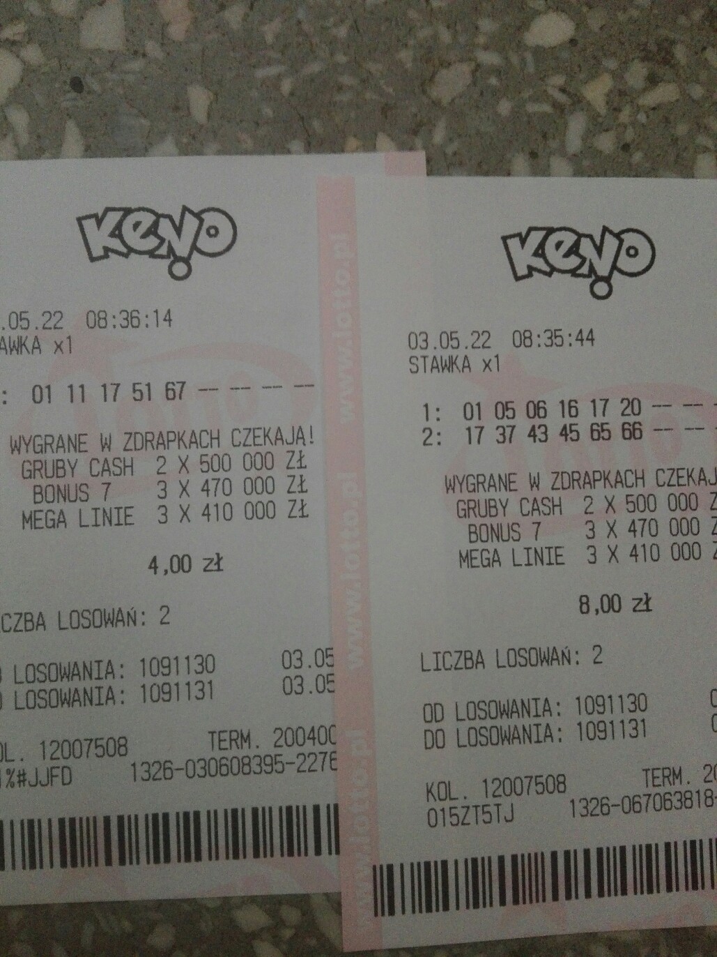 Dzięki. Wieczorem udało się jeszcze trafić 18 zł na te same liczby na 3 losowania