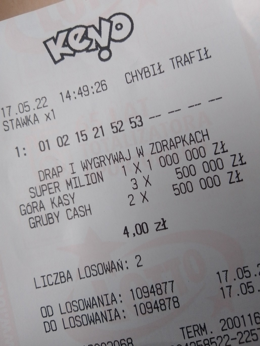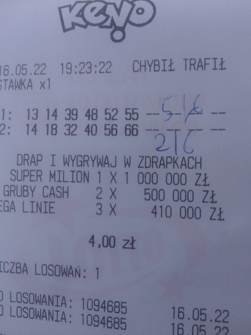 No i na koniec się powtórzę: wygrana 5/6 to tylko wygrana na tzw dalszą grę, no chyba że się trafi parę razy na dzień lub przez parę dni pod rząd. Kokosów na tym nie mam, tym bardziej że gram bez stawki i mnożnika. Gram bo lubię Keno i tyle. Jak mi nie będzie szło, to też będę próbował tylko za np.4zl/Dz. Sporadycznie zagram o jakiś finansowy konkret typu 8)8 9/9- bez efektu- już nie o główną nawet chodzi tylko choćby min. 6/8, czy 7/9