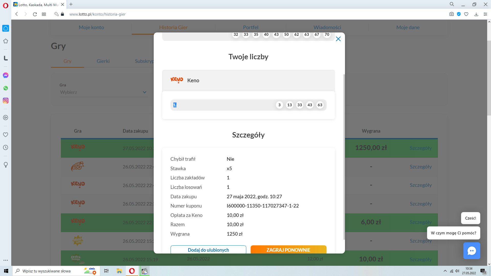 Zdjęcia zapomniałem dodaćAszmodai pisze: ↑20 maja 2022, 11:39Od przedwczoraj próbuje sposobu DrapkaZdrapka puszczając zakłady keno na 6 liczb sugerując się ostatnimi losowaniami z tą różnicą że puściłem je na 4 losowania zamiast 2.