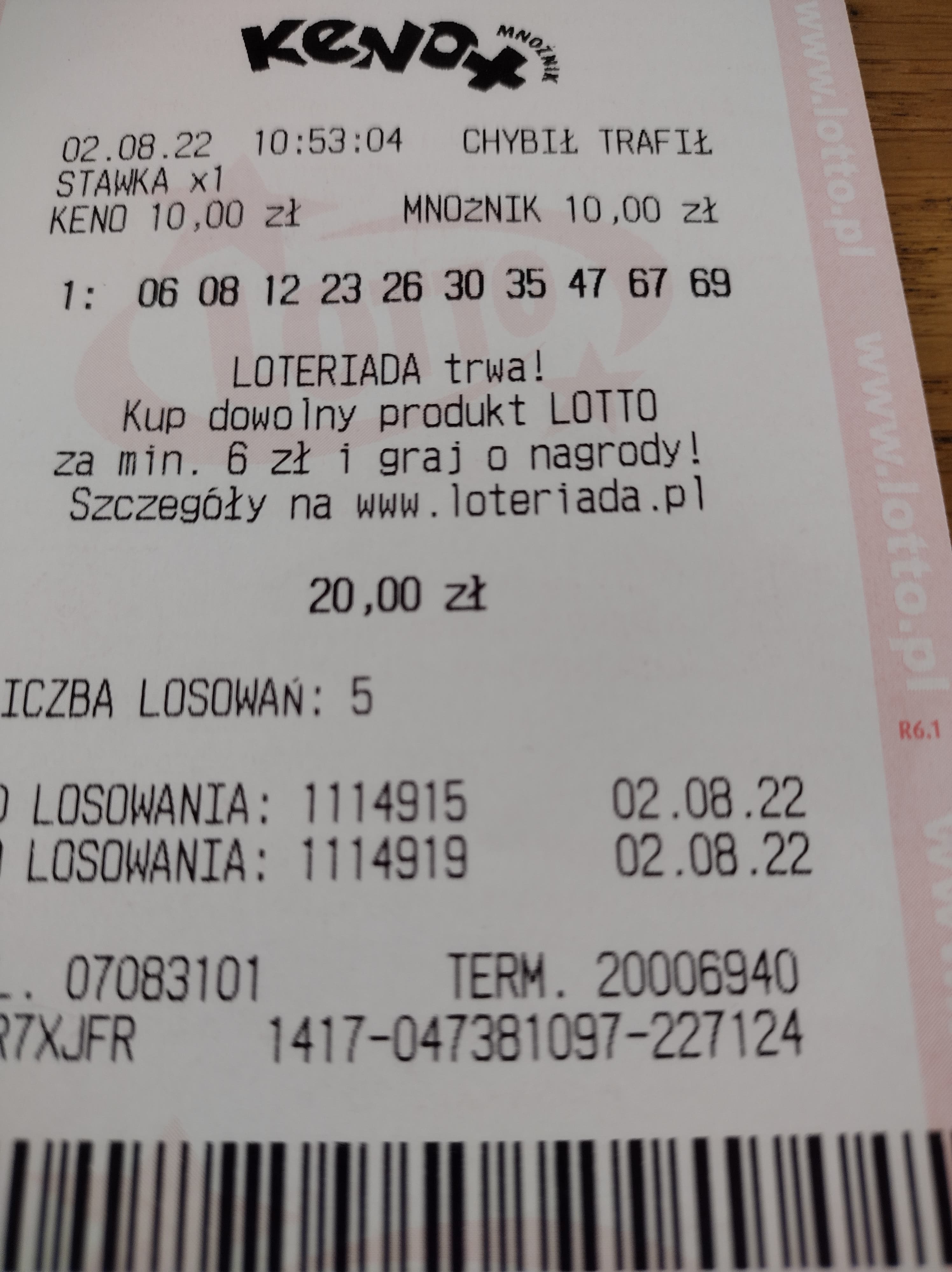 Zawsze grałam na 10 liczb.W grudniu trafiłam 5 z 5 razy pięć i tak zostałam przy piątkach ale ostatnio mi nie szło. Sama drobnica.Dziś wróciłam do 10 i coś się ruszyło.Na 6 liczb próbowałam kilka razy ale chyba to nie moja liczba:)
