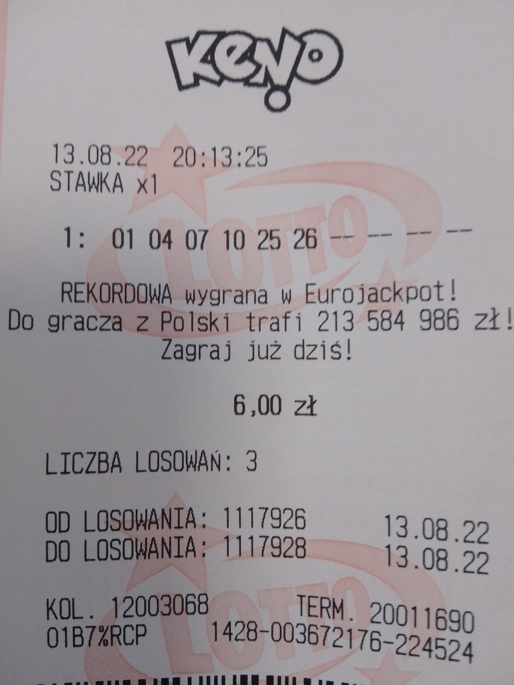 Czasami sobie pykam w keno, ale zawsze mam pecha do mnożnika. W pierwszym losowaniu miałem 4/5 z mnożnikiem x1, a w drugim 2/5 oczywiście z mnożnikiem x4.