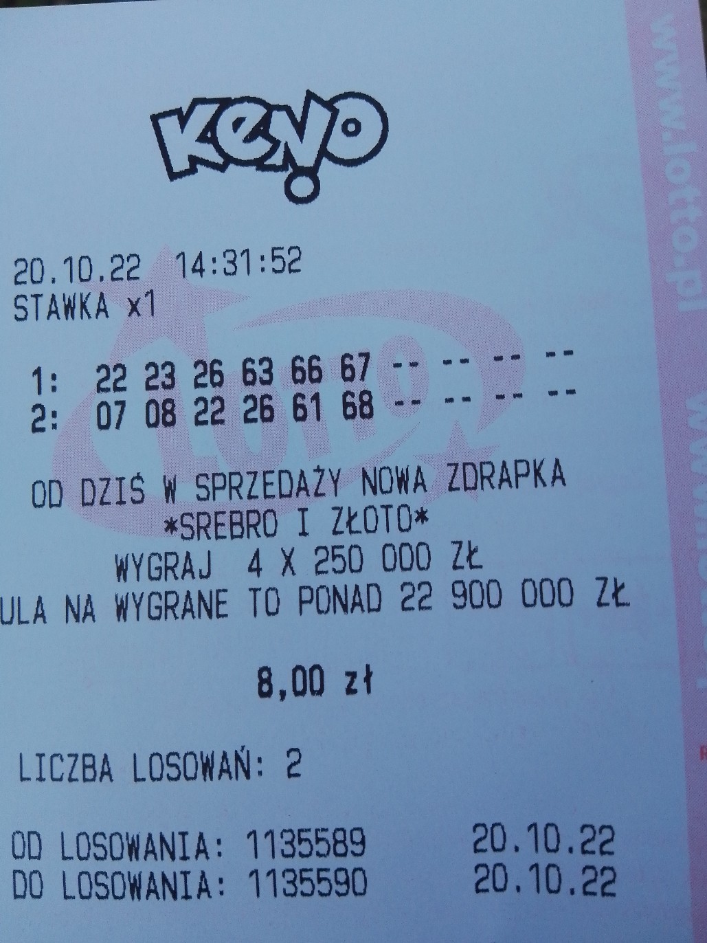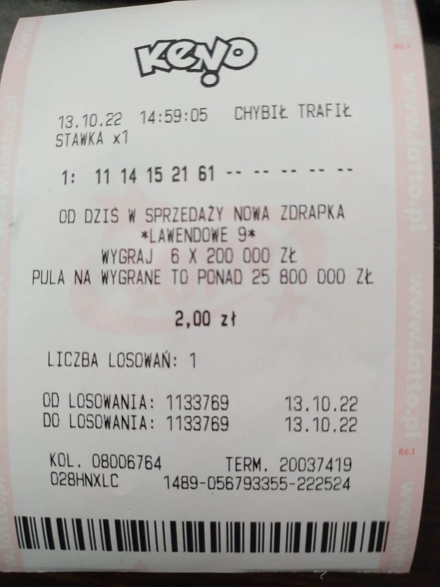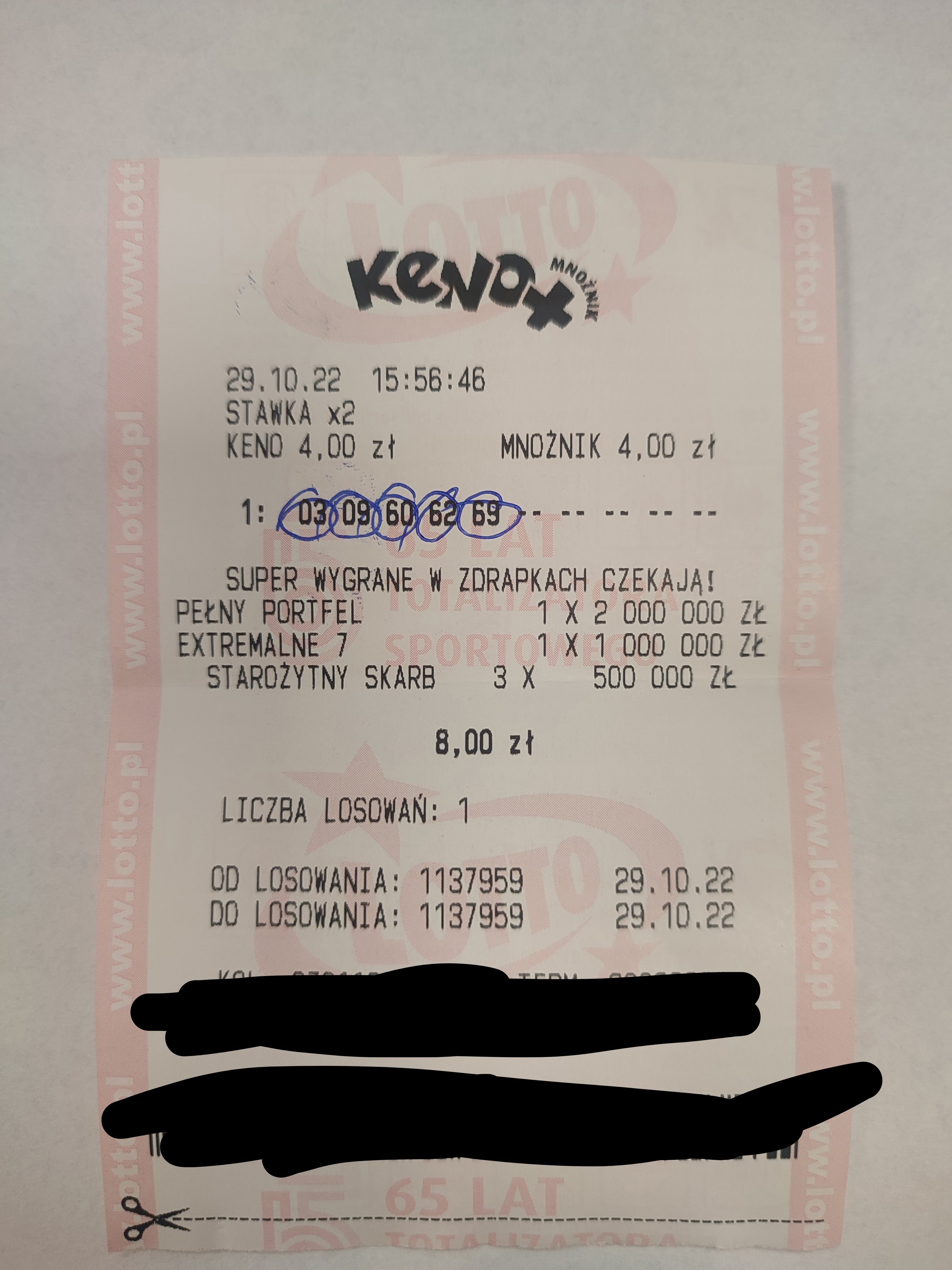Historia taka dziwna mi się przydarzyła i ten kupon był puszczony tak przypadkowo, że tą historię mógł zmyślić ktoś z TS-a aby podbić sprzedaż. Poszedłem wymienić parę zdrapek w punkcie. Niestety okazało się, że skaner kodów nie działał, przez co nie mogłem wymienić zdrapek. Żeby nie odchodzić z pustymi rękoma (a czekałem z 5 minut) poprosiłem o kupon z terminala. Wybrałem Keno 5 skreśleń za 2 zł na CT i taki widok zobaczyłem, jak byłem wymieniać zdrapki w innym punkcie