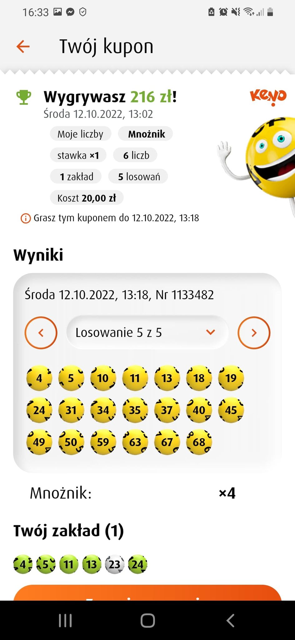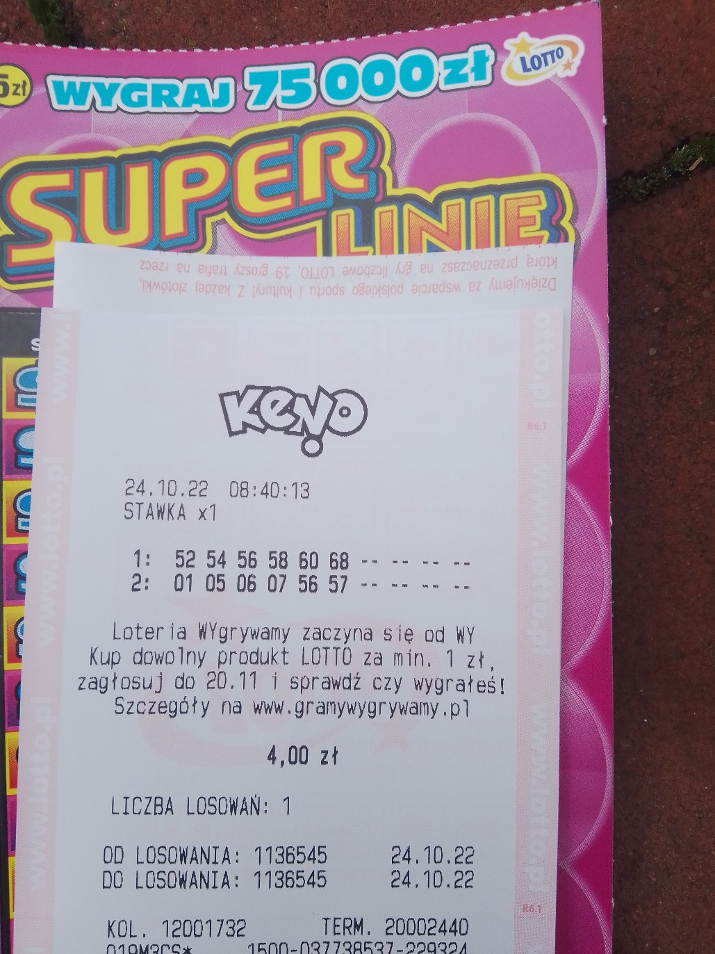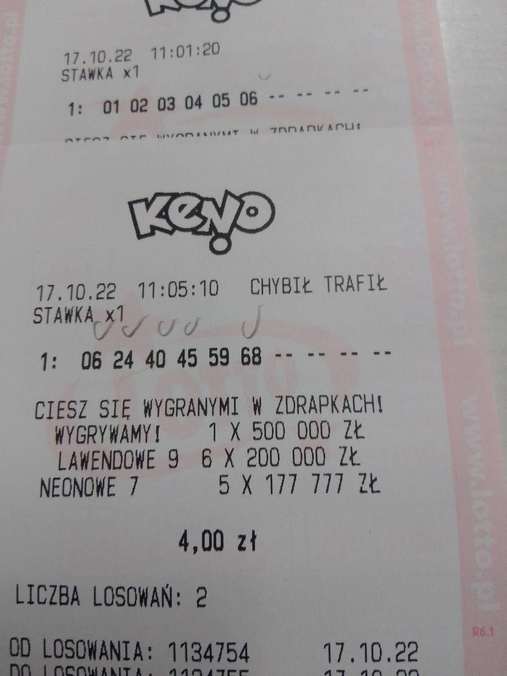 Historia taka dziwna mi się przydarzyła i ten kupon był puszczony tak przypadkowo, że tą historię mógł zmyślić ktoś z TS-a aby podbić sprzedaż. Poszedłem wymienić parę zdrapek w punkcie. Niestety okazało się, że skaner kodów nie działał, przez co nie mogłem wymienić zdrapek. Żeby nie odchodzić z pustymi rękoma (a czekałem z 5 minut) poprosiłem o kupon z terminala. Wybrałem Keno 5 skreśleń za 2 zł na CT i taki widok zobaczyłem, jak byłem wymieniać zdrapki w innym punkcie