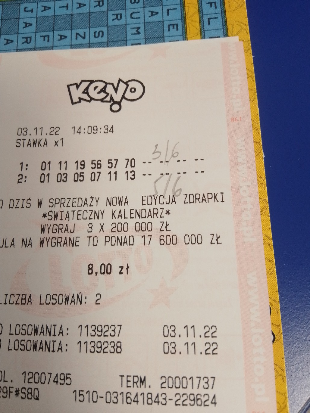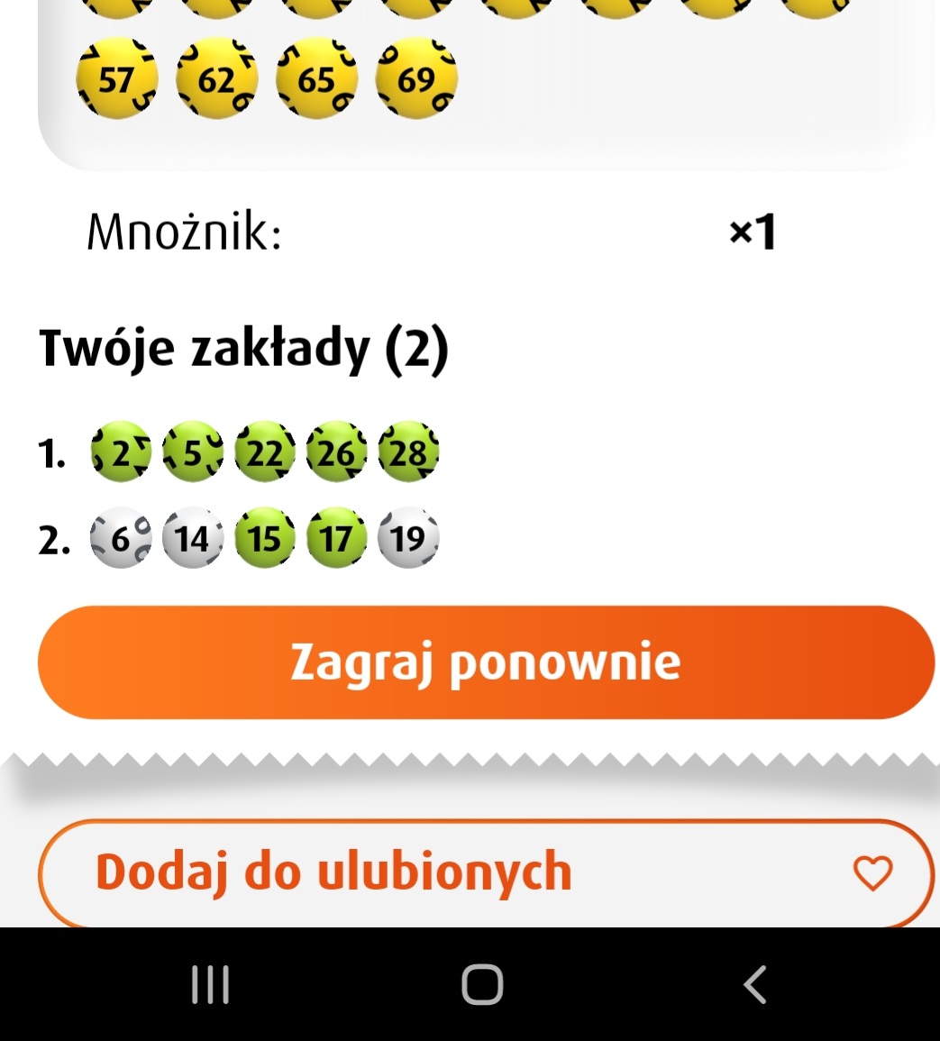 Dzięki. Ale dziś mam pecha- 61,62,64,66,67,69 taki zakład miałem skreślony na 3los. I pech polega na tym, że miałem rano na nim raz 4/6 i przechodząc przed południem k/żabki chciałem go powtórzyć - niestety coś tam nie działało a wpadłoby 6/6, a drugi pech był niedawno w tej samej żabce, gdzie terminal już działał ale nie zdążyła mi powtórzyć zakładu na bieżące los.- a wpadłoby 5/6 na te same liczby.