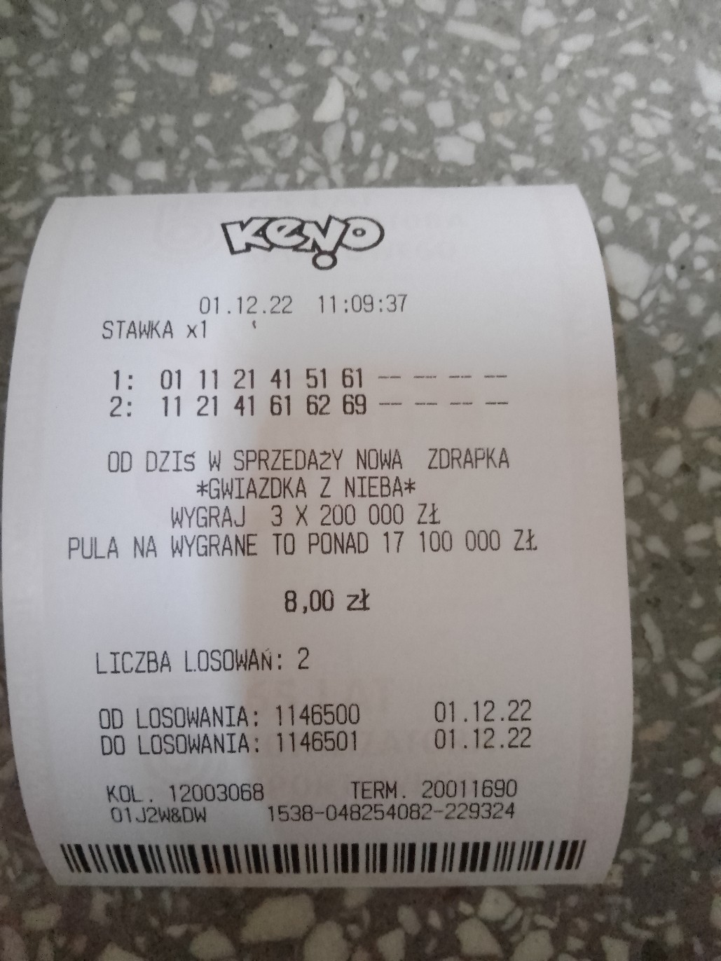 Na CT nic, na WT nic. Puszczam na 20 losowań - wpada po jednej liczbie.