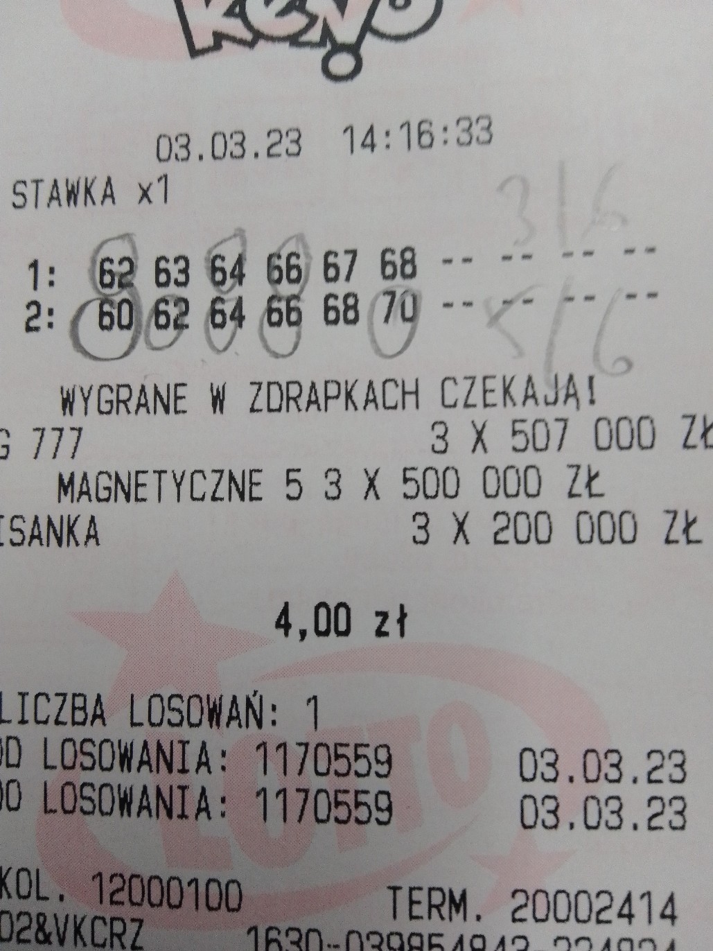 Ostatnio, zamiast grać z mnożnikiem, gram na stawkę x 4. Ostatnio wpadło 3/5, a dziś 4/5 - mój osobisty rekord 😁