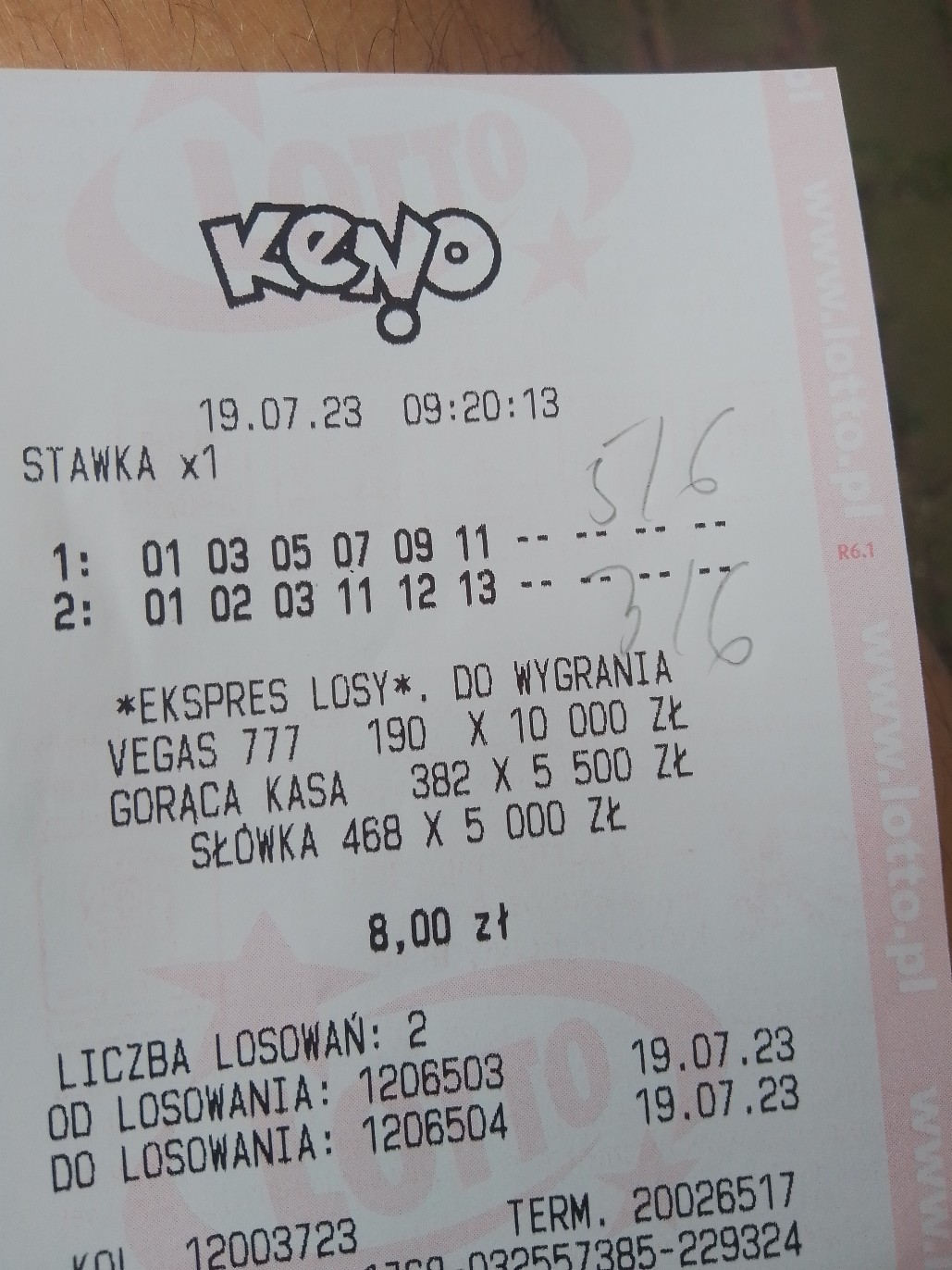 A liczby do multi multi jak dobierasz?Oloboga pisze: ↑19 lip 2023, 21:43Pierwsza złota zasada Keno to nie biegamy po całym kuponie tylko obieramy dwie góra trzy linie. Przy 5-tkach i 6-tkach świetnie się to sprawdza. Jeśli gramy na kilka zakładów to w każdym dajmy co najmniej 3 takie same liczby. Ponadto są zestawy liczb które że sobą wylatują razem bardzo często np. 14,20. 22,24,25. 65,69, 2,5,6. Był taki zestaw który jakiś czas temu wylatywał co trochę, ale chyba się kapnęli i go wyłączyli, a konkretnie 18,36,39,45,48. Wracam do Keno po kilku latach przerwy bo wygrywałem baaaaaaaaaardzo często 5/5, czasem 6/6 a i 7/7 raz się trafiło. Potem jak wsadzili w monitor szybkie 600 to moim zdaniem zaczęło się oszukiwanie w Keno. No a teraz to zobaczęgram też w multi multi i tam też parę razy 5/5 i 6/5. Życzę powodzenia i Wam i sobie