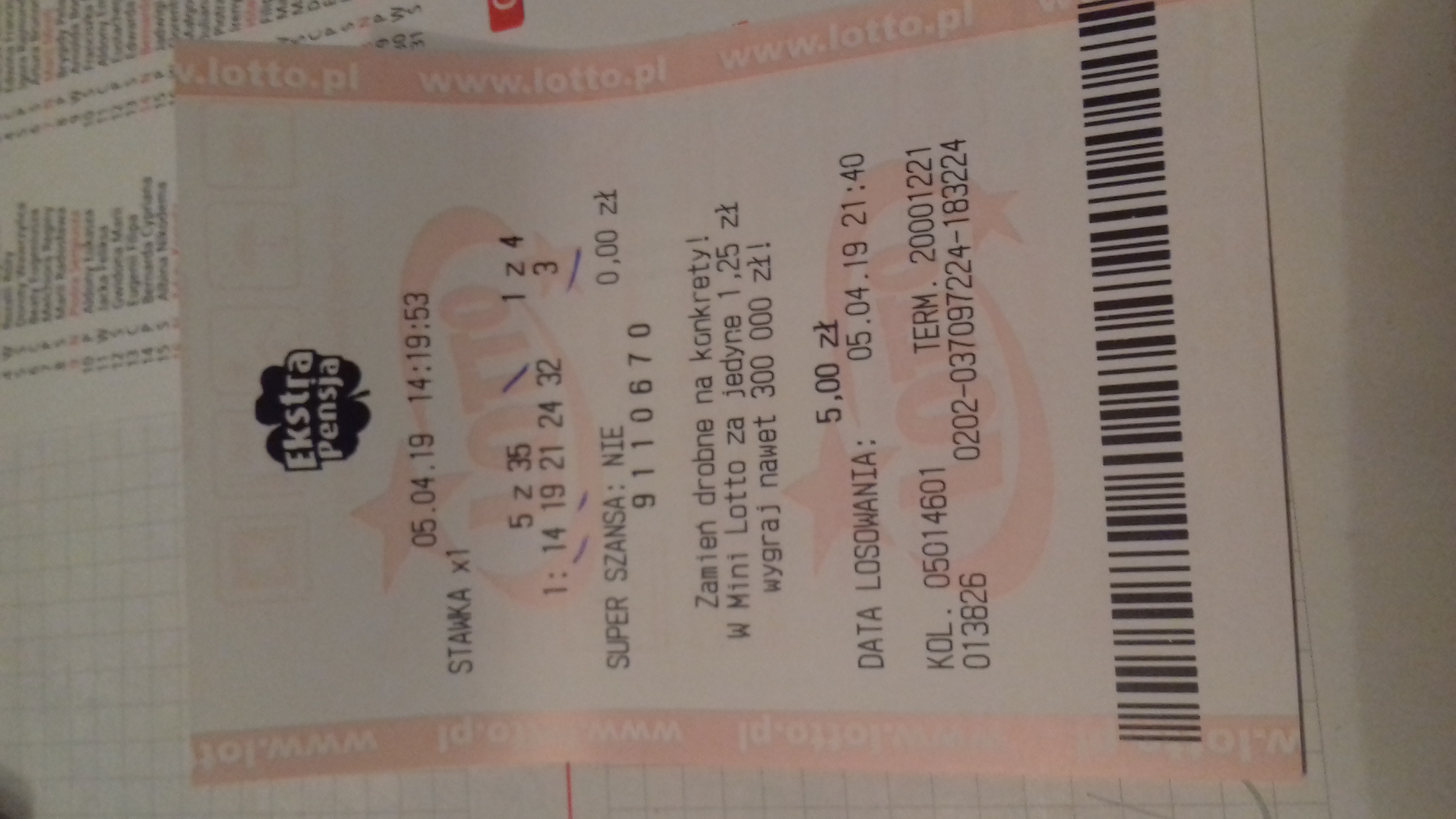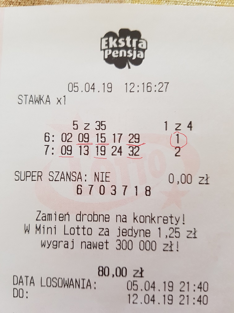 U mnie trafione 9, 19, 32 ale bez 3 więc tylko 25 Pln. Razem mielibyśmy 4 + 1