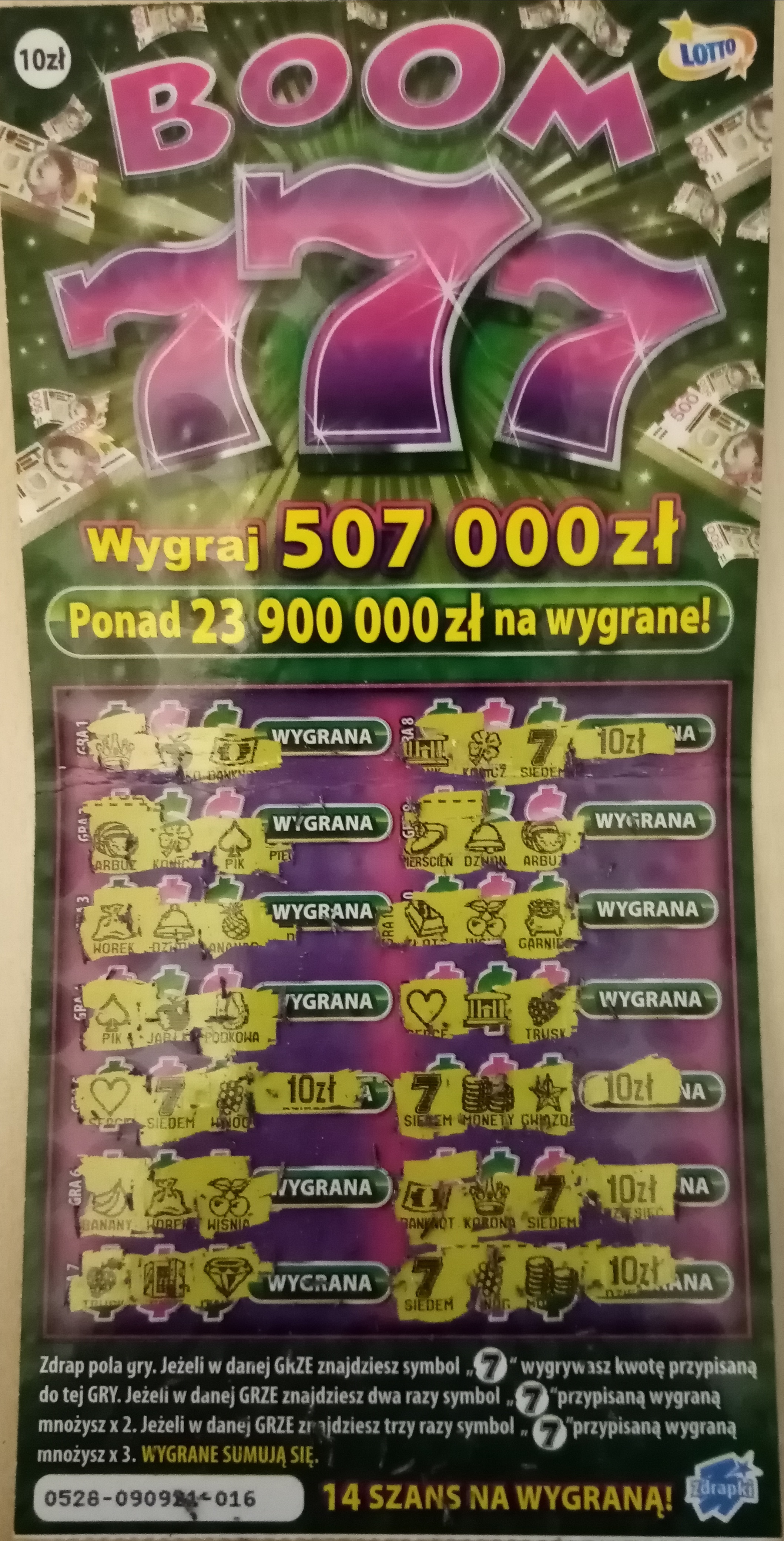 Suma sumarum atrakcyjne numery paczek w zdrapce boom 777 to zakres 000001-100000, w nim powinna znajdować się ostatnia główna wygrana.