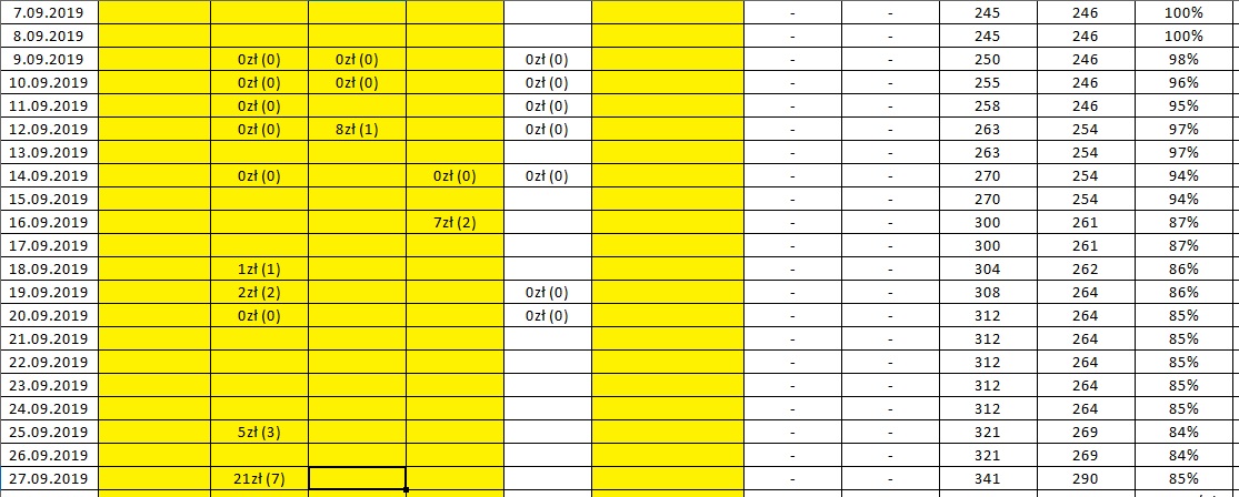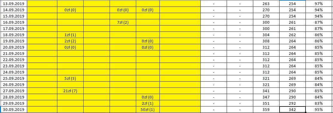 Normalnie jak w szwajcarskim zegarku, ostatni dzień września i komplet jeśli chodzi o zdrapki z arkusza i właściwie we wszystkich w cenie 1-10zł osiągnąłem to co chciałem. Myślałem że z pół roku minie zanim wszystkie odpadną a wystarczyły niecałe 2 miesiące. Jeśli chodzi o arkusz to jestem bardzo zadowolony z wyniku, jak widać jadąc na samych zdrapkach w cenie 1-3zł da się wyciągnąć nawet 95% zwrotu a poza arkuszem było jeszcze 360 w szczęśliwych liniach, 100zł w big 777 i coś jeszcze. Zdecydowanie ostatnie 2 miesiące to była moja najlepsza passa w ciągu 12 lat gry.