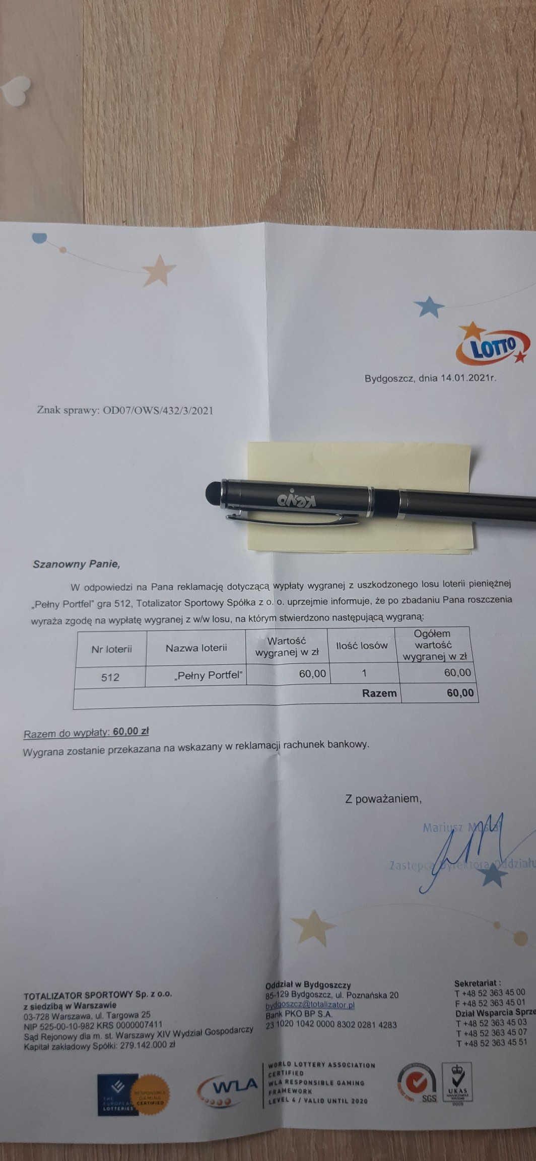 Rozumiem, że po przesłaniu do Totalizatora wniosku i zdrapki, przyjdzie odpowiedź pisemna? Bo wysłałam już jakiś czas temu do Katowic kupon wraz ze wnioskiem i czekam