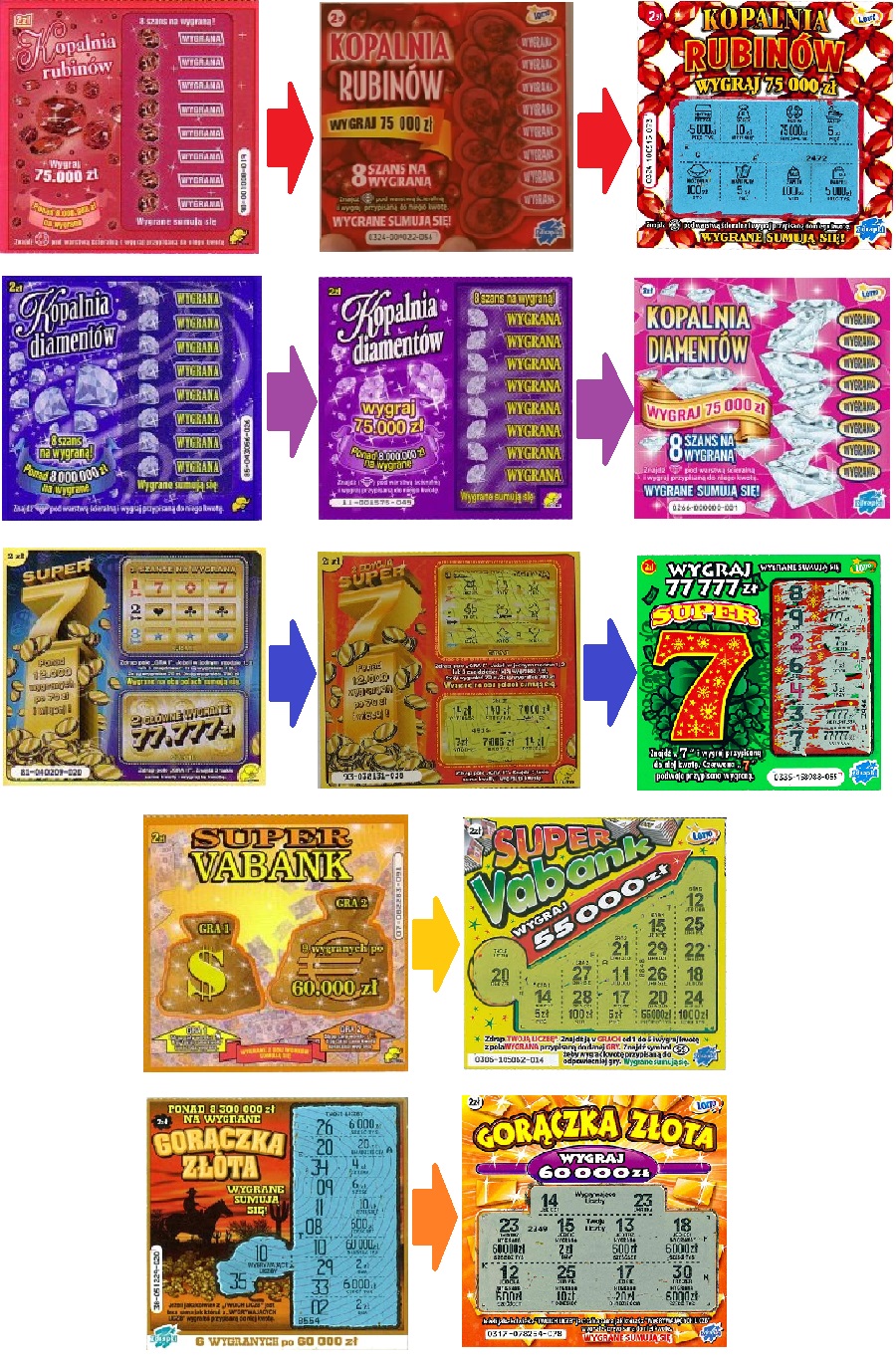Dlatego też zdrapki mają coraz łatwiejszą strukturę gry, żeby jak najgłupsi ludzie byli w stanie zrozumieć zasady, jak również żeby jak najmniej wygranych większego stopnia trafiało do graczy, kilka przykładów z życia wzięte: