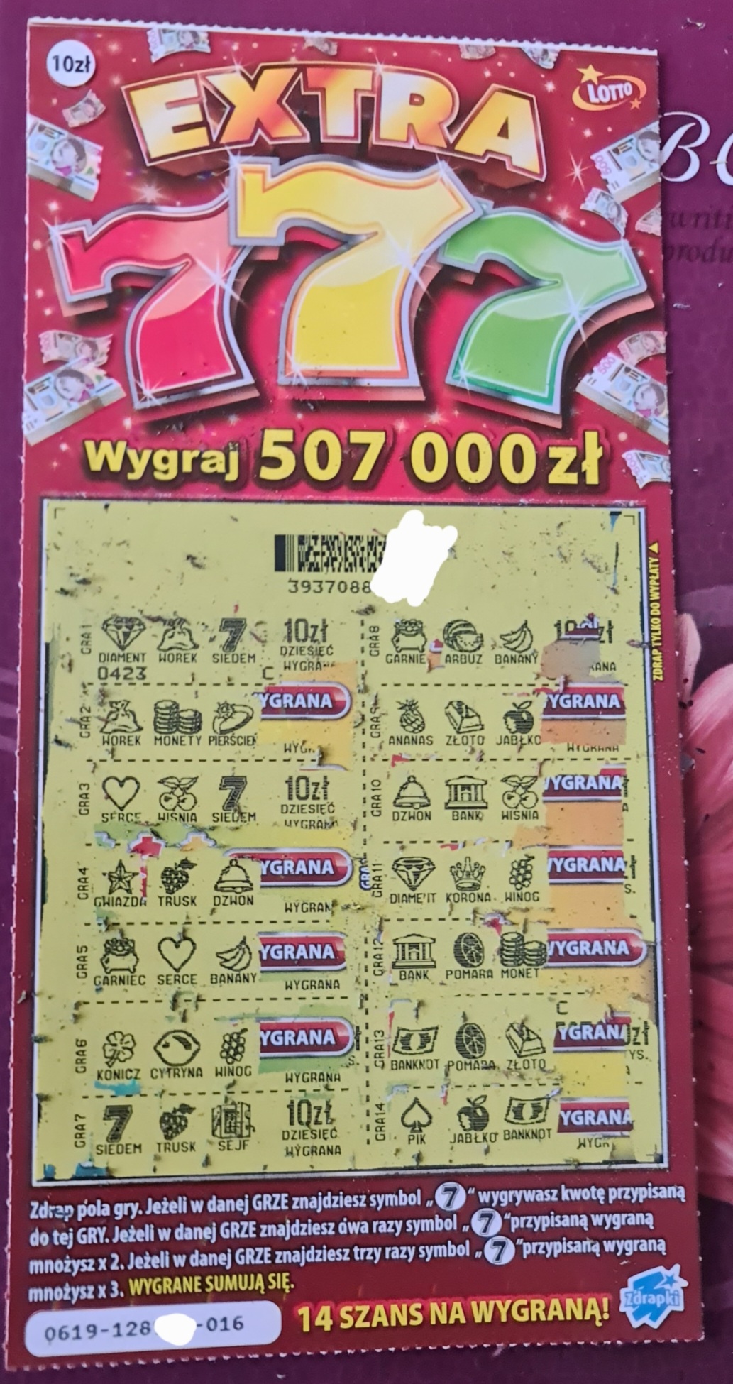 Przecież w tym temacie było pisane że zostają literki kontrolne oraz numer. Jak widać wyżej numer został.pat94 pisze: ↑23 lut 2022, 17:04Mi się wydaje, że tego numeru 2222 już nie będzie, oni po prostu wzięli starą wersję zdrapki i ją przerobili na aktualny wzórtak samo na stronie pod siódemkami są symbole ze starej wersji, nie chciało im się nawet zrobić nowego wzoru tylko podstawili pod aktualną. Dlatego ten kod jest wyblakły, od teraz tylko będzie kod kreskowy i literki kontrolne.