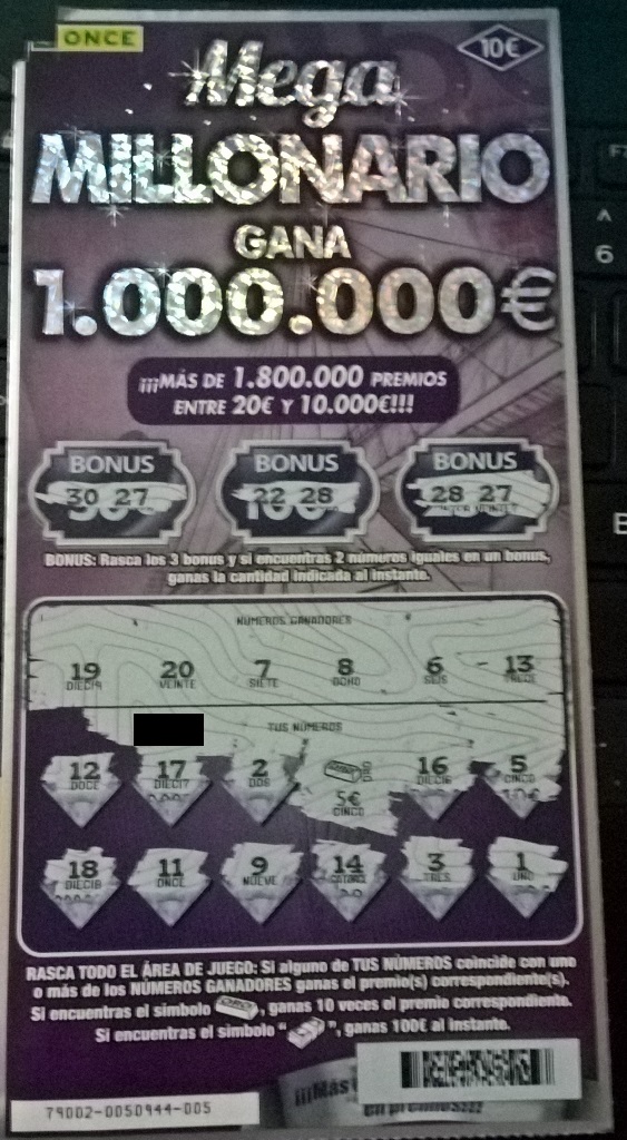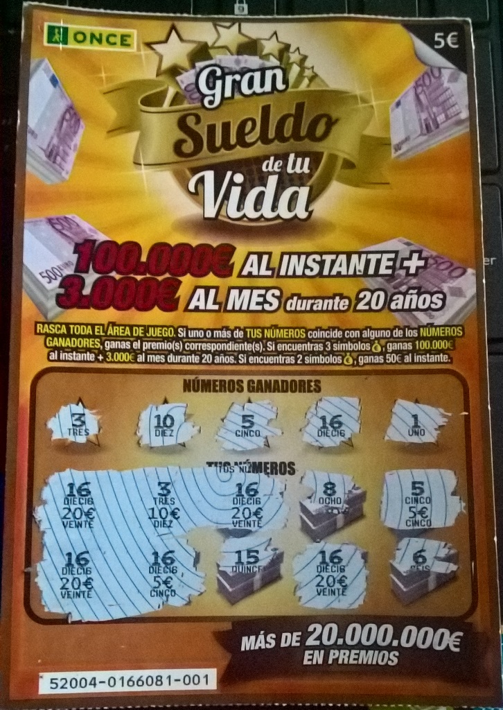 Wyspy kanaryjskie, a konkretnie La Palma. Intensywnie zwiedzam i przejechałem już ponad pół wyspy. Gdy tylko trafię jakiś punkt z logo "Once" od razu zaglądam. Sama wyspa trochę dzika, a większe miejscowości zliczysz na palcach jednej ręki. Kupa wiosek gdzie nawet o bar czasami ciężko ;) Zdrapki tutaj schodzą słabo (przynajmniej te od 5tki). Wczoraj na przykład pociągnąłem zdrapy na shellu i dostałem z jednej numer 025. Wcześniej byłem tam kilka dni temu i miałem numer 004 z tej samej paki. Czekam teraz na panią z kramikiem, ale w niedzielę się nie rozstawia. U niej ciągnę tą pakę za dychę. Na razie na sześć losów miałem 3 pełne ale max wyciągnięty to 20€ więc może siedzi tam jeszcze coś grubszego. Mam nadzieję, że ją jutro spotkam to zerknę jak to wygląda. Fajnie byłoby 100 jura wydrapać, ale nie będę narzekał gdy do końca pobytu uda mi się chociaż trochę jeszcze minus zniwelować.