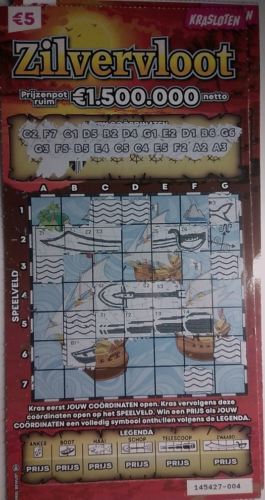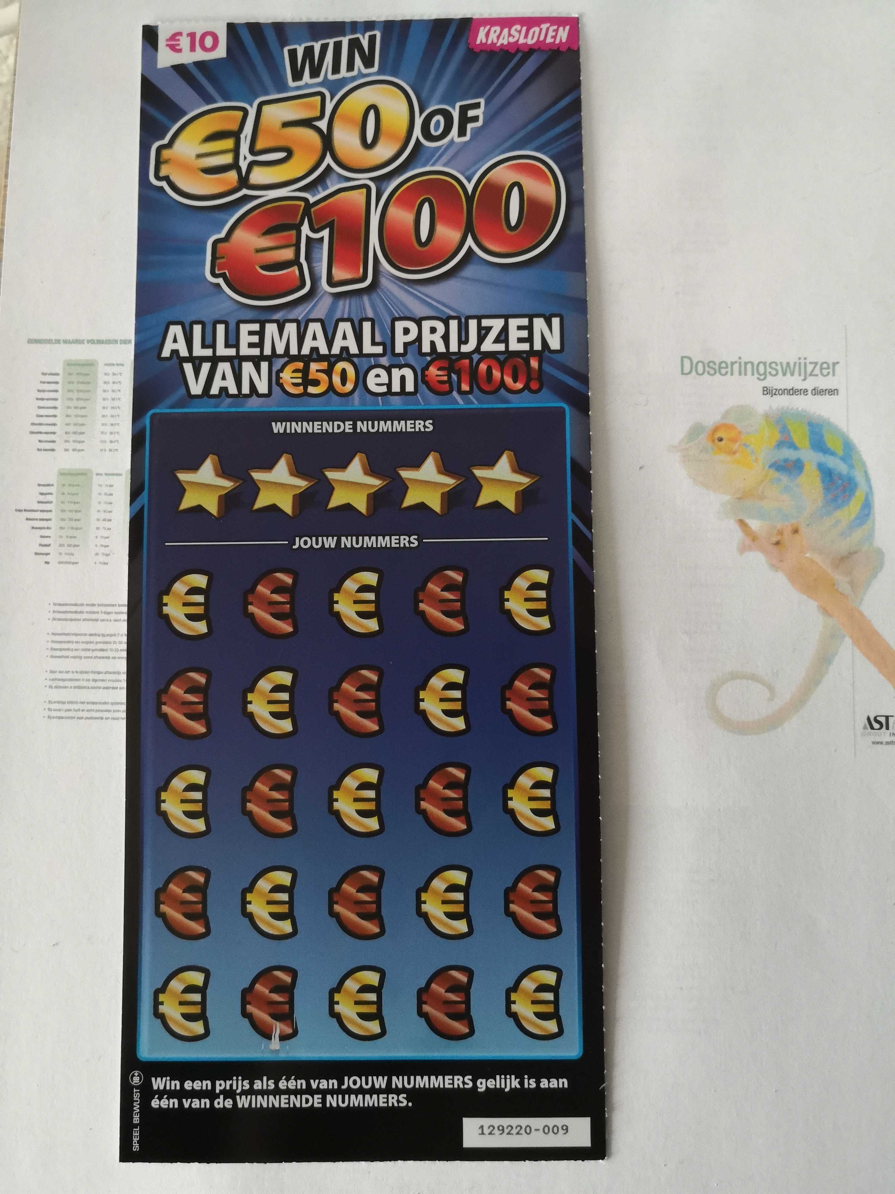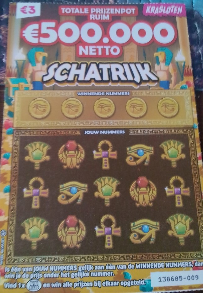 To ja dodam jeszcze jedną niderlandzką zdrapkę. Można w niej wygrać 50 lub 100 euro. Wygrywa 1 na 9,5 (pula zdrapek to teoretycznie 500.000 a wygrywających jest około 55.000).