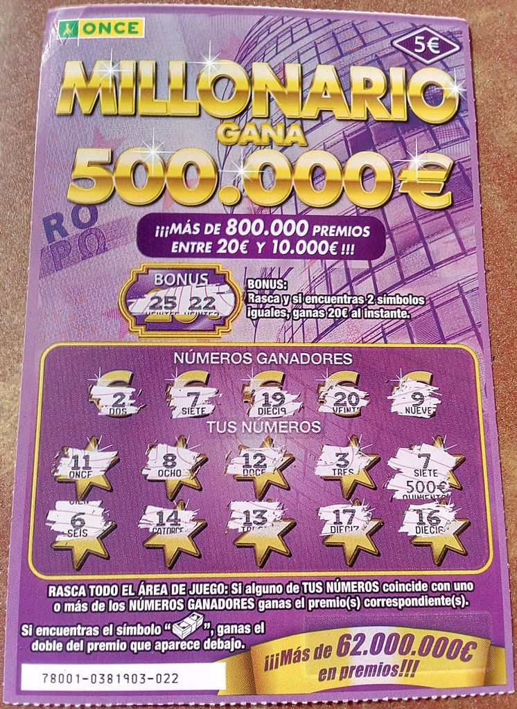 Wartości zakupionych zdrapek: 2x10€, 7x5€