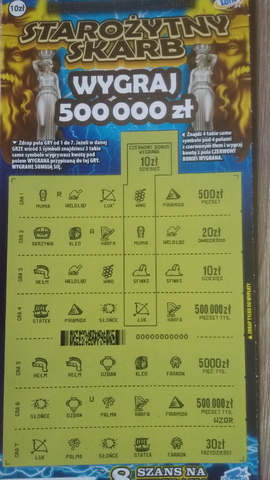 Tak wygląda po zdrapaniu, fajne egipskie, antyczne symbole. Tabela wygranych jest ta sama co w Lewandowskim ;)