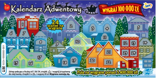 A były innych zdrapek grafiki?Luna_83 pisze: ↑13 wrz 2019, 20:29Dzisiaj przywieźli do mojej kolektury Świąteczne odliczanie. Grzybek i Mejkap dobrze przypuszczaliJest to zdrapka formatu Brylantów,ma 24 pola do drapania,taki typowy świąteczy motyw w odcieniach niebieskiego. Na pewno główna wygrana wynosi milion złotych,drugi stopień,o ile dobrze pamiętam to 50000.Jest też symbol prezentu,jak się go znajdzie to wygrywa się przypisaną kwotę.Przedstawiciel nie zostawił regulaminu więc nie wiem jaki będzie nakład. Postaram się zrobić jej zdjęcie i tu wstawić