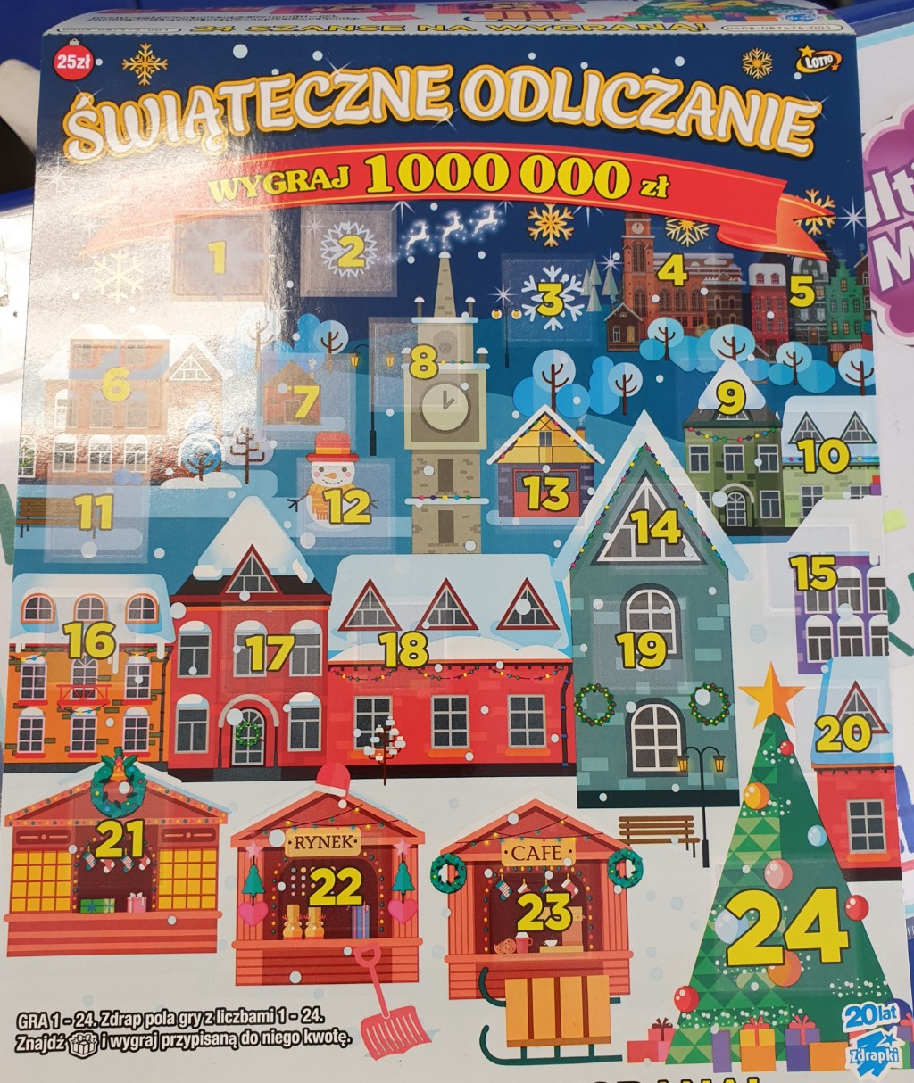 To nie grafiki,widziałam ją na żywopat94 pisze: ↑13 wrz 2019, 23:11A były innych zdrapek grafiki?Luna_83 pisze: ↑13 wrz 2019, 20:29Dzisiaj przywieźli do mojej kolektury Świąteczne odliczanie. Grzybek i Mejkap dobrze przypuszczaliJest to zdrapka formatu Brylantów,ma 24 pola do drapania,taki typowy świąteczy motyw w odcieniach niebieskiego. Na pewno główna wygrana wynosi milion złotych,drugi stopień,o ile dobrze pamiętam to 50000.Jest też symbol prezentu,jak się go znajdzie to wygrywa się przypisaną kwotę.Przedstawiciel nie zostawił regulaminu więc nie wiem jaki będzie nakład. Postaram się zrobić jej zdjęcie i tu wstawić