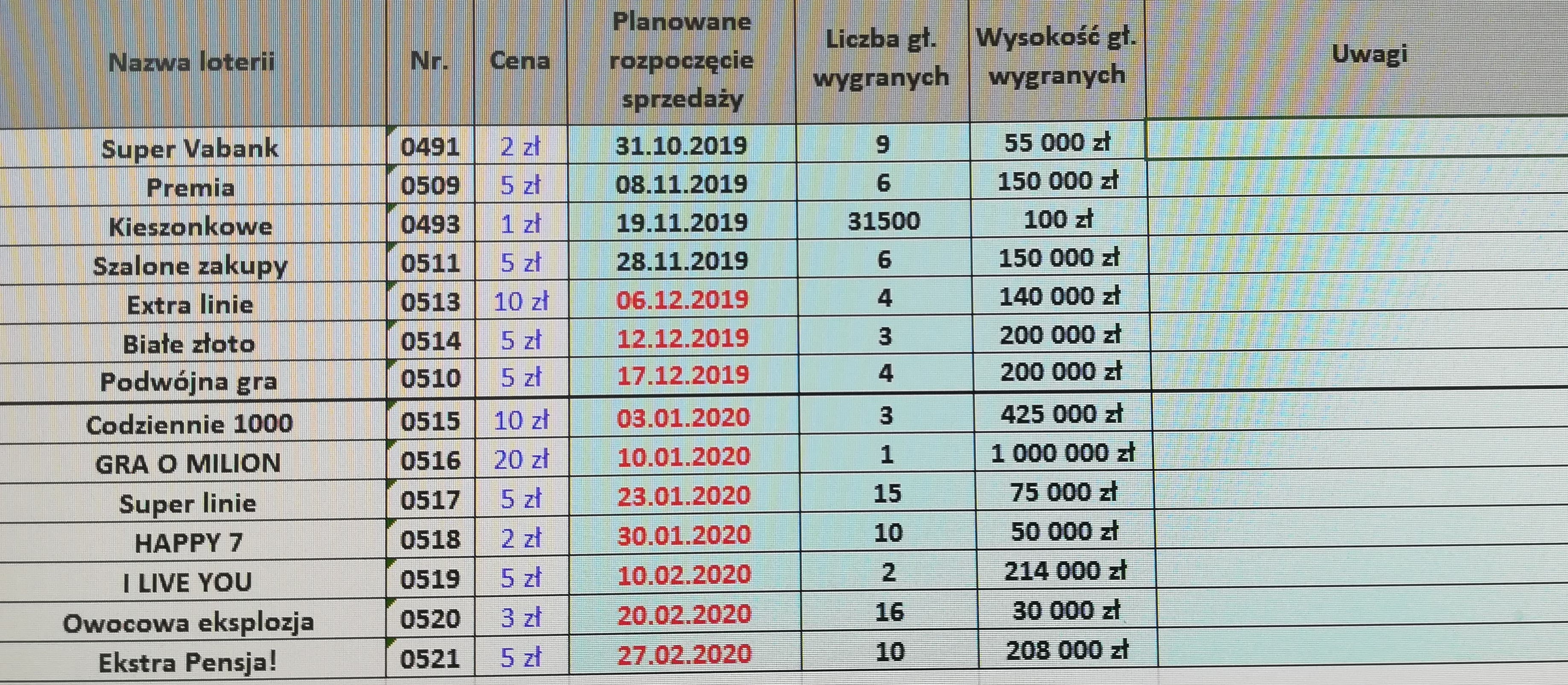 Planowane zakończenia sprzedaży zdrapek - zmiany: