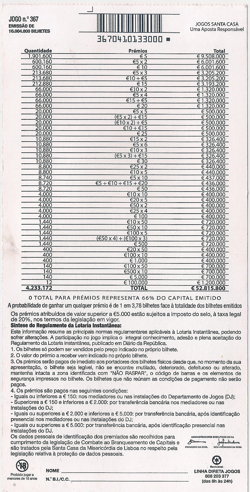 Generalnie zdrapka za 5euro, 16 mln nakładu, prawdopodobieństwo wygranej 1:3,78, kod kreskowy z tyłu odpowiadający dokładnie numerowi zdrapki.