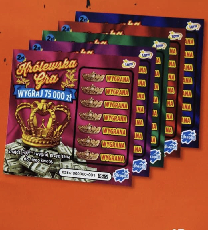 Królewska gra, bardzo mi się podoba. 5 kolorów w paczce, w ogóle ta grafika nie najgorsza, będzie dobra warstwa ścieralna, szukamy symbolu diamentu, stara klasyczna formuła z góry na dół. Główna 75000zł. Zdrapka wygląda jak kolejna edycja "kopalni diamentów/szafirów" ale niestety wydaje mi się, że tabelka będzie zupełnie inna i gorsza.