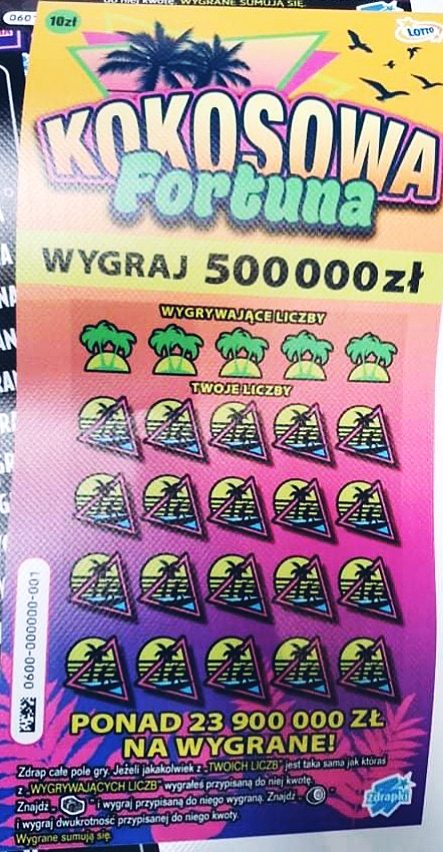 Kokosowa Fortuna - zdrapka o wyglądzie wakacyjnym z palmami a oni wprowadzają to jesienią. Usmiechnij się- to samo. Czy tak trudno było im zrobić coś jesiennego, halloweenowego, z symbolami liści i jesieni…? Kompletny brak logiki.