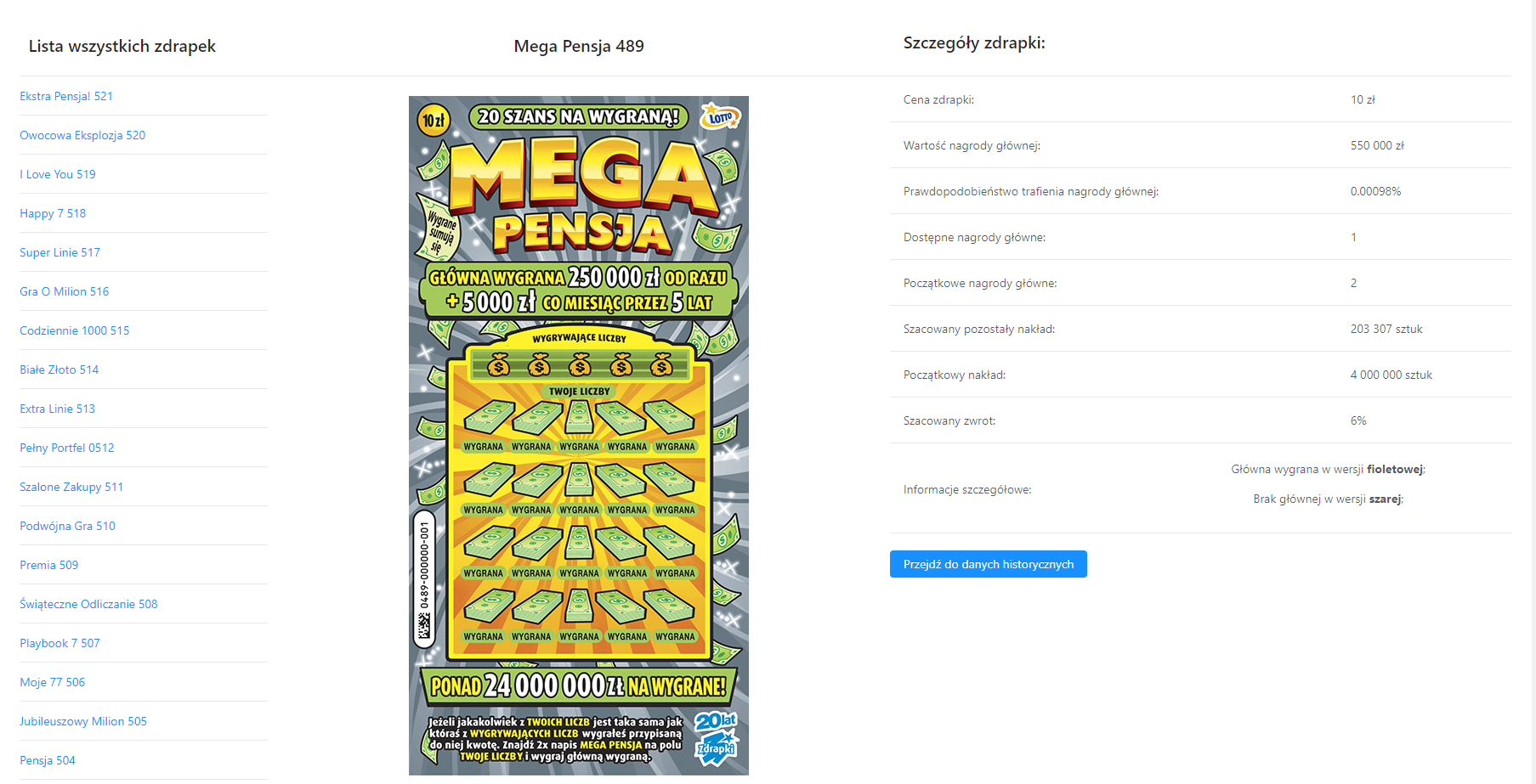 - Sortowanie danych po wielu parametrach: nazwa zdrapki, cena, szansa na główną wygraną, itp.