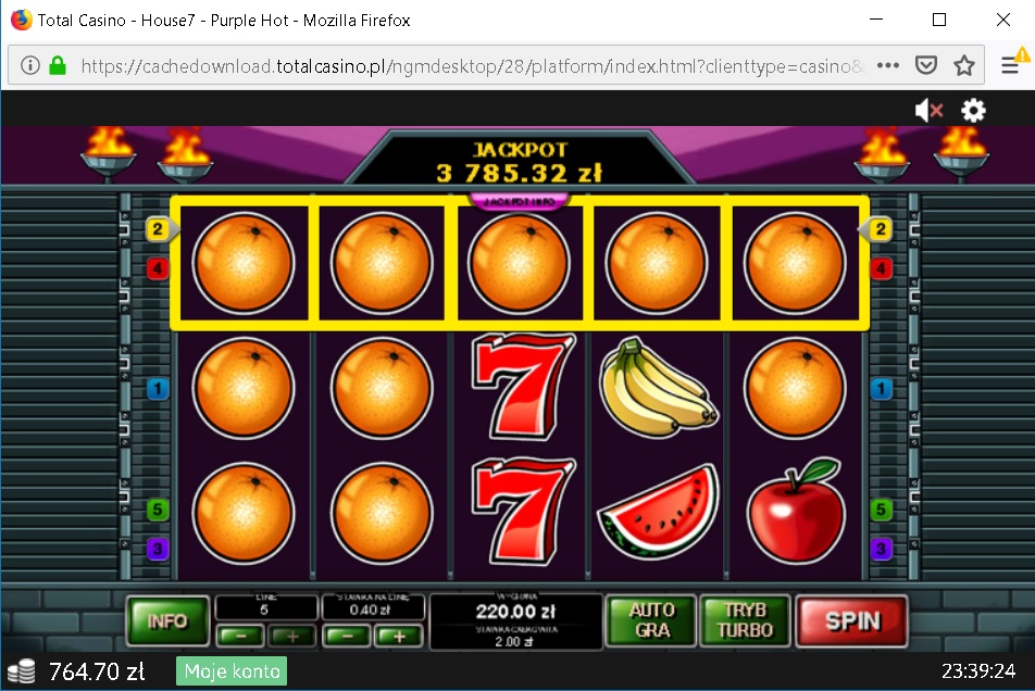 To jest Purlple Hot z Jackpotem zależnym od stawki całkowitej. Zauważyłem, że wygrane padają falami tzn. gram i pustak goni pustaka a potem nagle 100 zł, 50 zł, 20 zł, zwroty i nagle znowu pustaki raz za razem. Póki co mam 41% obrotu i 473 zł. Teraz gram stawki 1 zł za zakrecenie 8-)