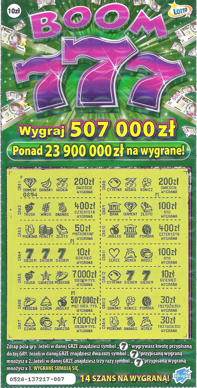 Big777 mnie nie lubiła, najwięcej w niej ustrzeliłem chyba max. 30 zł. W Boom777 nie nastawiam się na lepszy wynik. Dziś premierowa sztuka z nr 012 i pustak ale dam jej jeszcze szansę.