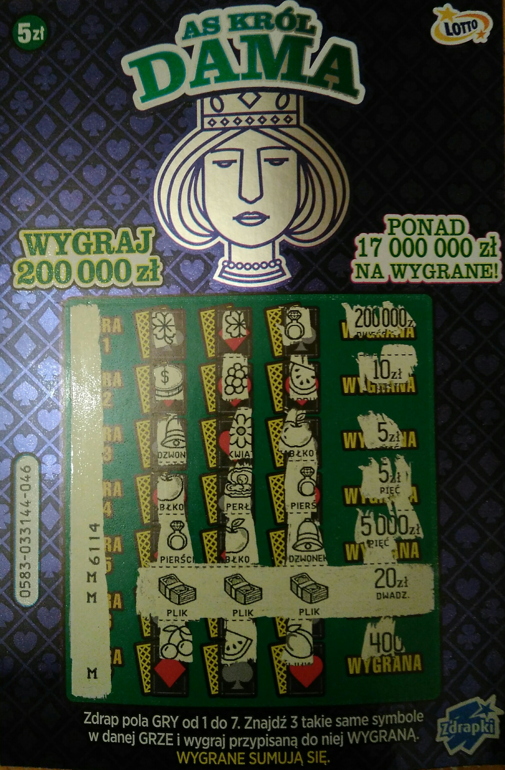 Ja pierdzielę, zenitu sięga moje rozczarowanie. To że dwa pustaki to normalne u mnie, ale... jak można naprawdę kopiować Premię i jeszcze wprowadzać w błąd (a tak będzie) masę ludzi z tymi symbolami. Poza tym zero motywu karcianego, zero.. ani bonusa, a zresztą same symbole to powinny być figury np. 4karo, 5karo, mogli zrobić cokolwiek, że suma kart w lini daje 13 czy cokolwiek. Zero pomysłowośći, warstwa slaba, po prostu zero przyjemności w drapaniu tego czegoś. Wygląd też nie jest najlepszy, spodziewałem się minimalnie mniejszej tragedii. Nie wezmę ani sztuki więcej.