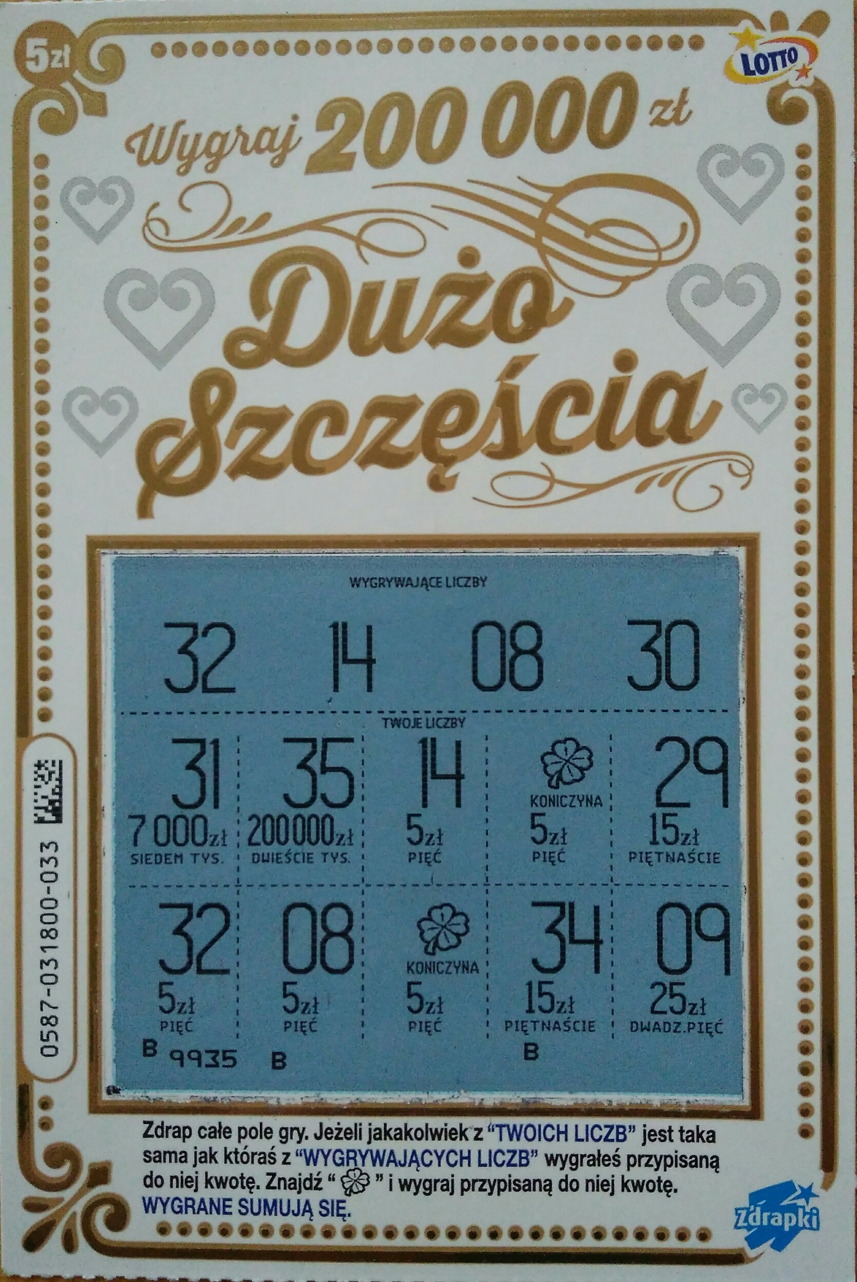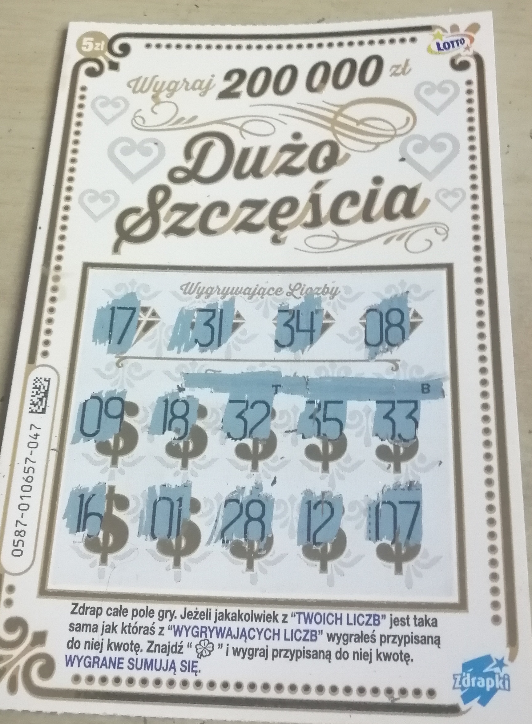 U mnie w ubiegłym tygodniu wzięta na próbę jedna sztuka z nr 008 ze zdrapkomatu i dyszka (dwa razy po 5 zeta pod koniczynką)