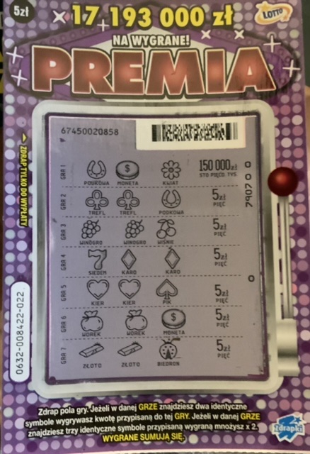 Zawsze mnie zastanawia, dlaczego ludzie nie czytają instrukcji na zdrapkach.. na grupie Lotto na fb ciągle ludzie wrzucają zdjęcia podrapanych zdrapek z zapytaniem 'czy jest tu coś?'Draper pisze: ↑27 maja 2022, 16:40Kupiłem jedną sztukę i wpadło 20zł. Mimo słabej tabelki dotychczas udawało mi się w niej coś wydrapać. Ciekawe ile zdrapek z wygranymi pojdzie do kosza, w punkcie koło mnie kobieta wyrzuciła 10zł, miała po 2 symbole w rzędzie ale szukała 3 symboli tak jak w As Kier.