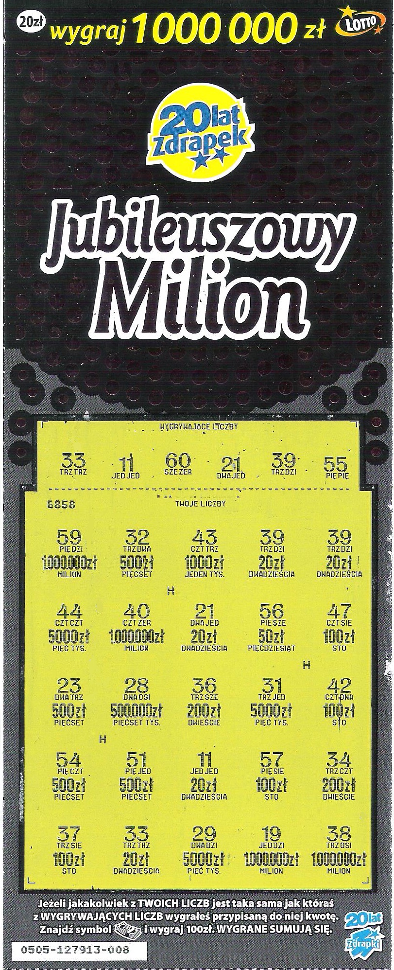 Wymieniając dziś rano zdrapki z soboty wzięłam dwa Jubileuszowe Miliony, numer 011 oraz 015.W obydwu były zwroty.Wymieniłam na numer 008 oraz 013.