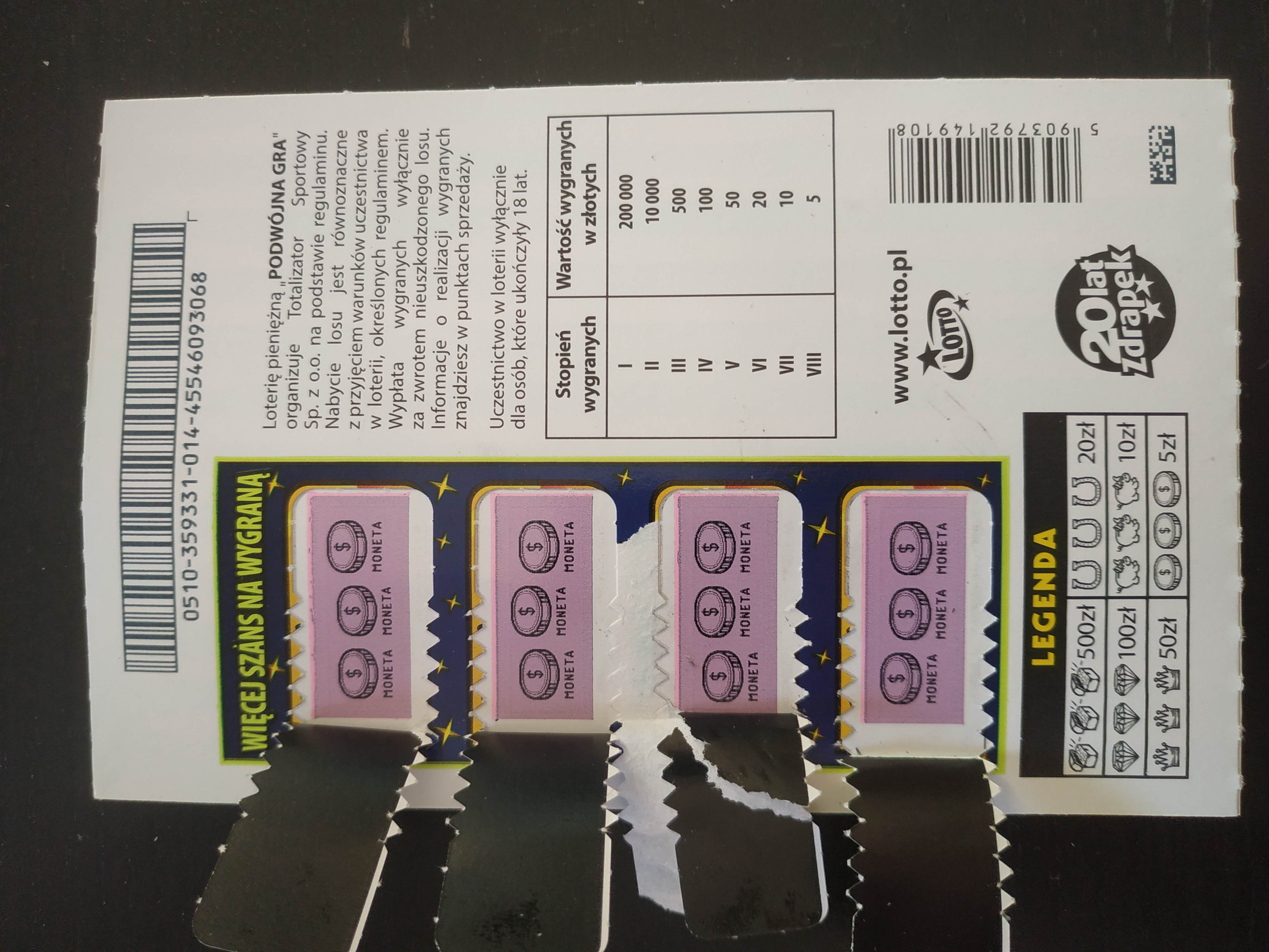 Graty. U mnie dziś 2 dyszki przy zakupie 1 szt. (001). Kilkanaście zdrapek już przerobiłem. Udało się trafić 50 zł, 20 zł, parę zwrotów, ale nigdy nie udało mi się wygrać choćby 5 zł. na tej wydzierance.