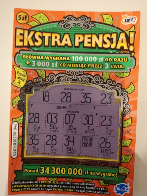 Dziś z dziewczyną drapaliśmy 4 sztuki Ekstra Pensji (2 z jednej kolektury, 2 z drugiej). Bilans to 3x 5 zł. Powoli kończą się u mnie jej zapasy, będzie ciężej znaleźć.