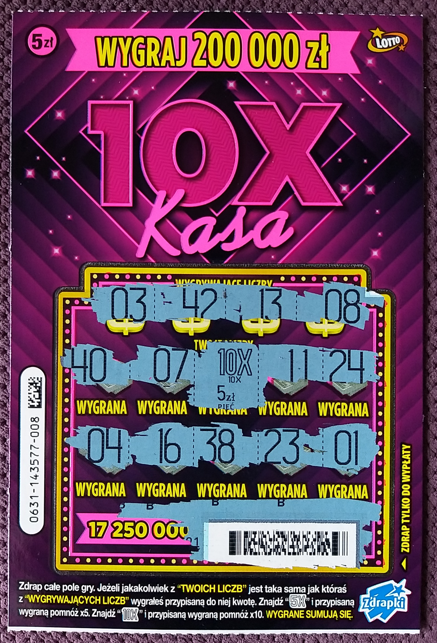 Kupiłem 11 sztuk fioletowej wersji. Ostatnie jakie były w pobliskiej kolekturze. 9 pustych i 2x po 25zl. Numery po kolei od bodajże 06 w górę.