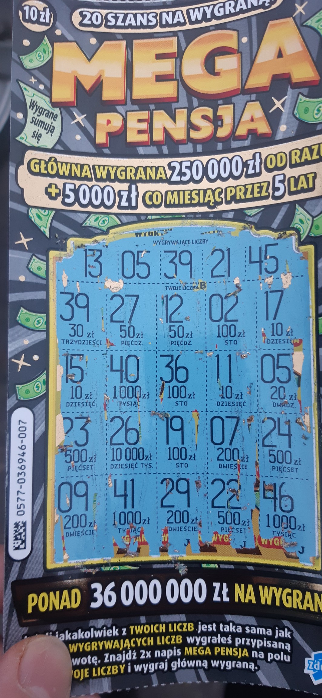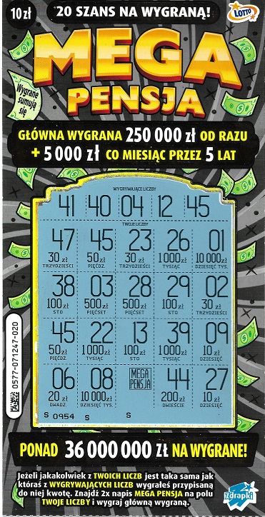 Ja drapałem MP z nr 019 i pod tą samą wygrywającą liczbą "45" miałem 20zł. W bilansie dnia podam zaraz co tam jeszcze udało się wygrać, ogólnie nam wszystkim wyszło łącznie 182zł.
