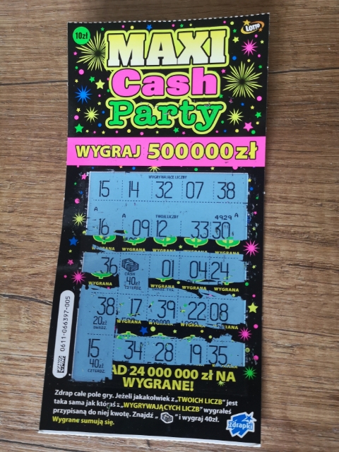 U mnie na dobre zaczęły się pojawiać paczki z bardzo niskimi numerami typu 005xxx, to też znowu ochoczo drapię maxi casha. Ostatnio wpadły jakieś drobne wygrane po 10 i 20zł, było też kilka pustaków, natomiast dzisiaj przy 1szt (013) trafiła mi się rekordowa wygrana w tej zdrapce - 100zł