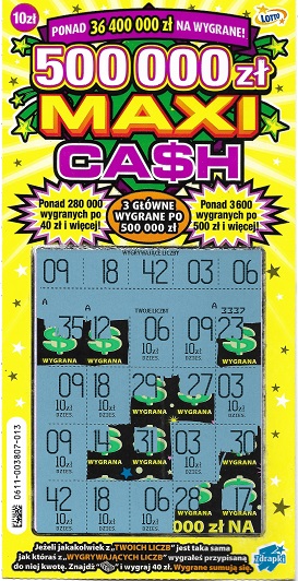 Kupiłem dzisiaj łącznie 3 maxi cashe (każdy w innym punkcie): jeden pustak, 1x10 (011), i na deser 1x40 (010). 40zł było nierozbite pod liczbą